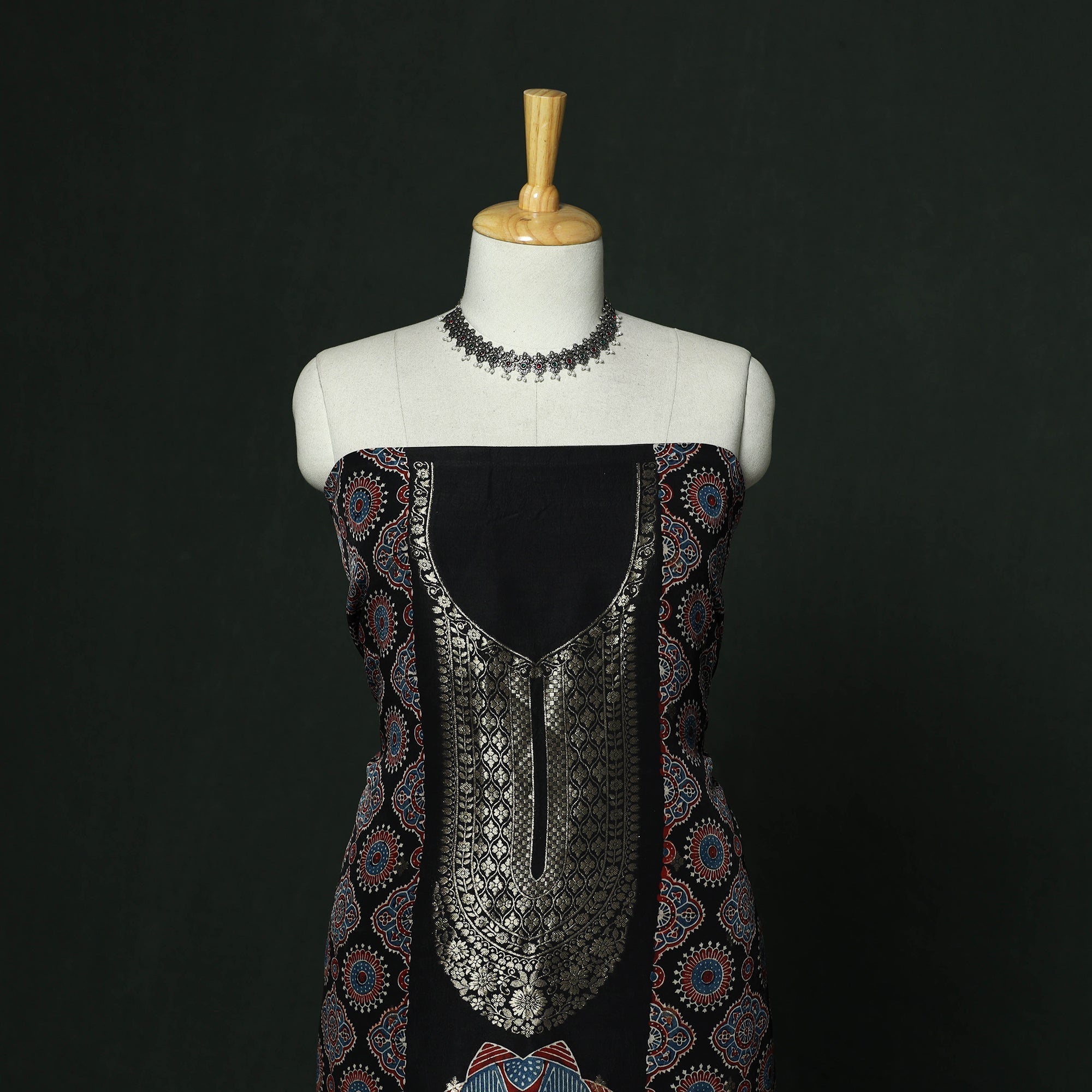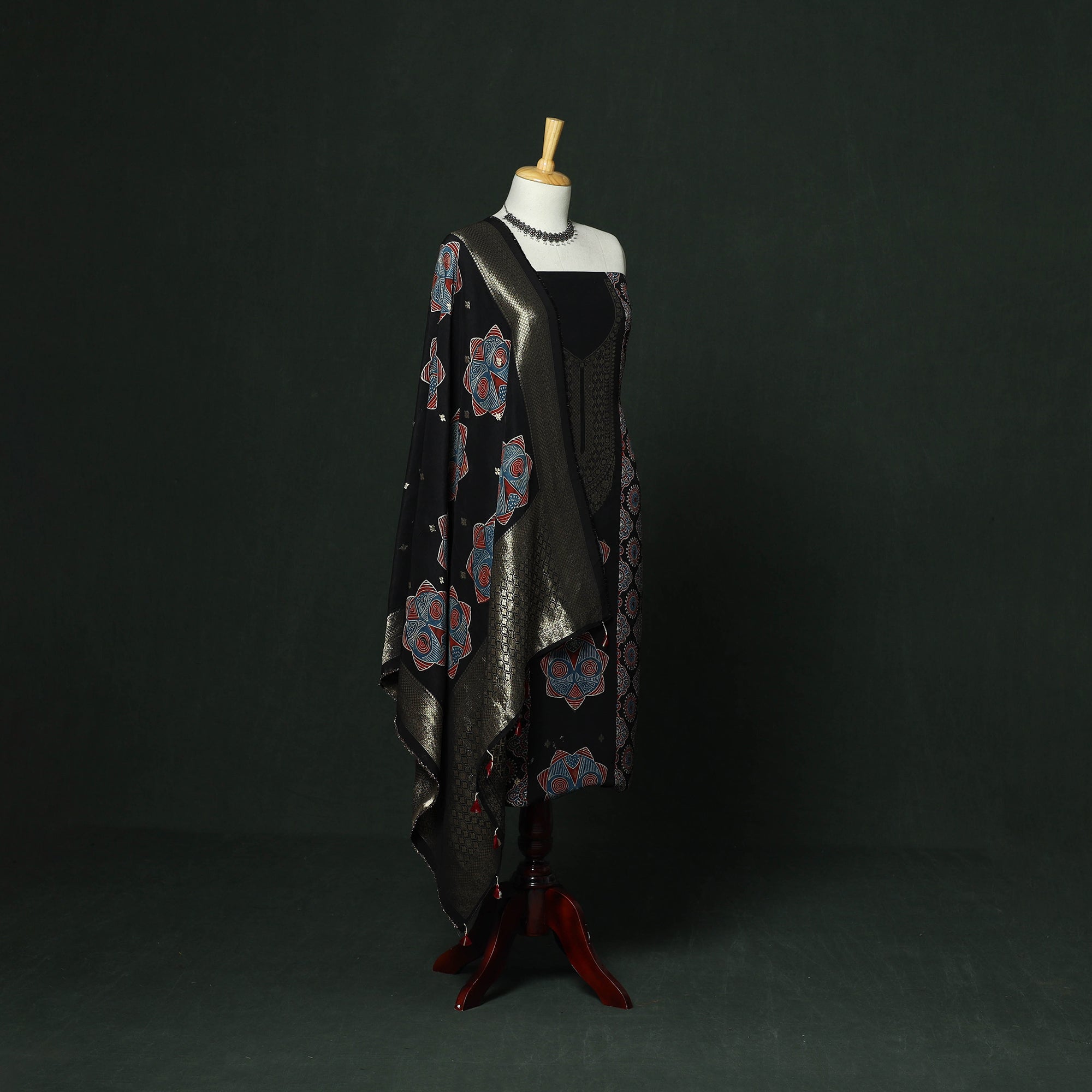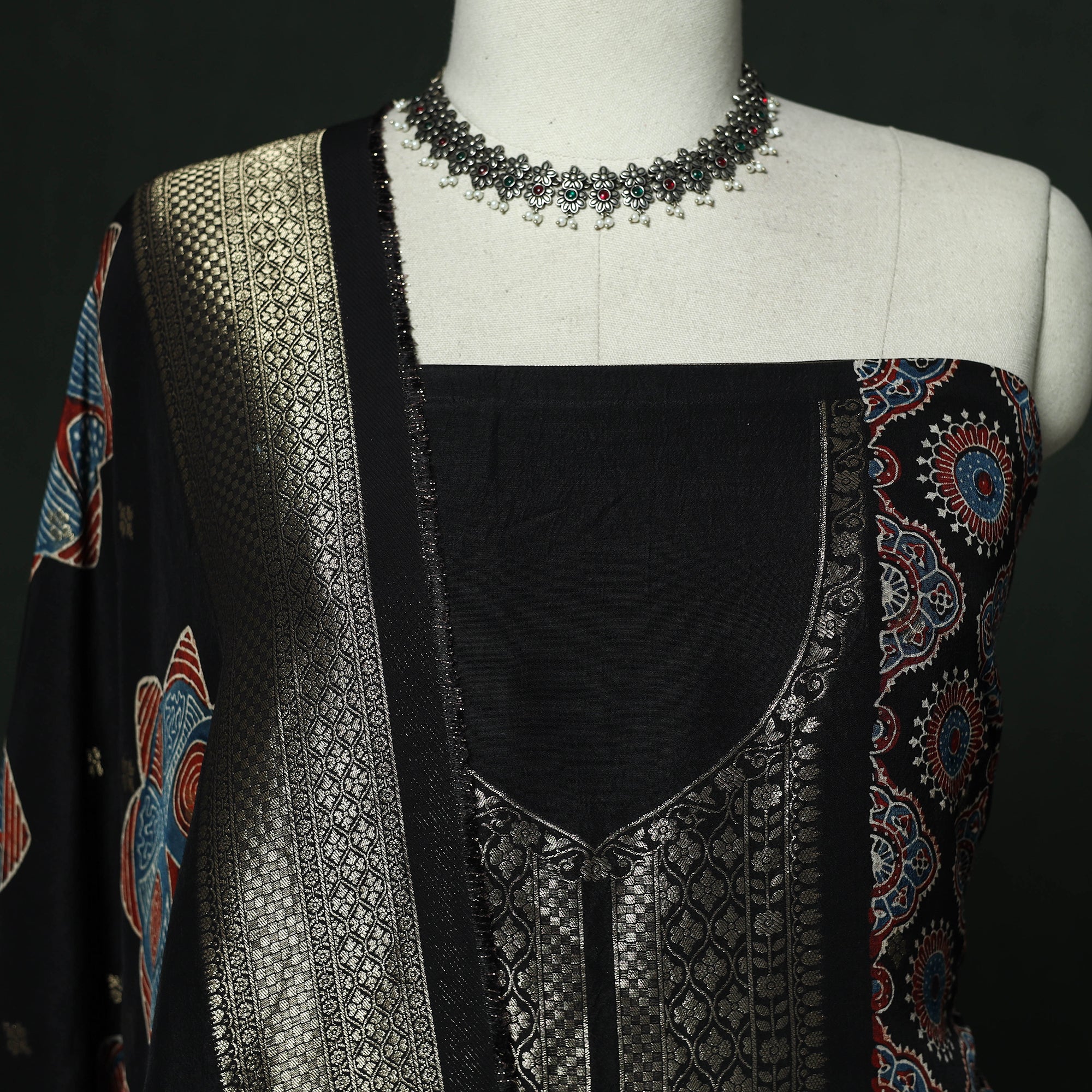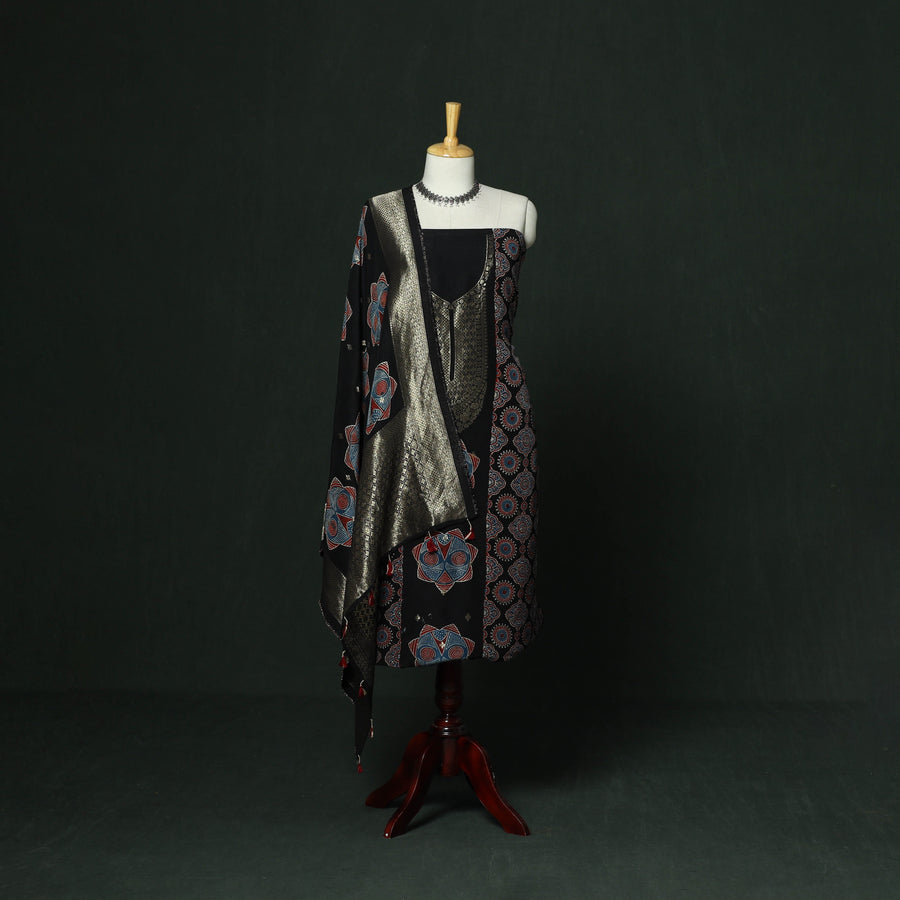 | Material | Black hand block ajrakh print natural dyed dola silk 2pc unstitched dress material from Kutch, Gujarat. The fabric features viscose in both warp and weft, giving it a smooth texture and graceful fall. It is created using traditional ajrakh printing techniques practiced by artisans of the region. This craft dates back over 4,500 years and is known for its intricate geometric patterns, developed through multiple stages of resist printing and dyeing. The 2pc suit set includes kurta fabric and a dupatta, both detailed with zari work, adding a festive touch. This set is suitable for special occasions or for creating a refined ethnic outfit. |