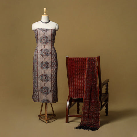 Hand block ajrakh print natural dyed 3pc unstitched dress material from Kutch, Gujarat, crafted using traditional ajrakh printing techniques by artisan Jabbar Khatri. This textile tradition dates back over 4,500 years and is known for its intricate geometric patterns achieved through multiple stages of printing and dyeing. The set includes kota doria cotton kurta fabric, a matching dupatta and a cotton bottom, making it suitable for festive occasions as well as an elegant everyday ethnic look.