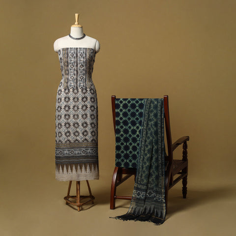 Hand block ajrakh print natural dyed 3pc unstitched dress material from Kutch, Gujarat, crafted using traditional ajrakh printing techniques by artisan Jabbar Khatri. This textile tradition dates back over 4,500 years and is known for its intricate geometric patterns achieved through multiple stages of printing and dyeing. The set includes kota doria cotton kurta fabric, a matching dupatta and a cotton bottom, making it suitable for festive occasions as well as an elegant everyday ethnic look.