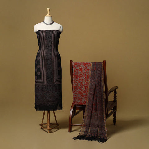 Hand block ajrakh print natural dyed 3pc unstitched dress material from Kutch, Gujarat, crafted using traditional ajrakh printing techniques by artisan Jabbar Khatri. This textile tradition dates back over 4,500 years and is known for its intricate geometric patterns achieved through multiple stages of printing and dyeing. The set includes kota doria cotton kurta fabric, a matching dupatta and a cotton bottom, making it suitable for festive occasions as well as an elegant everyday ethnic look.