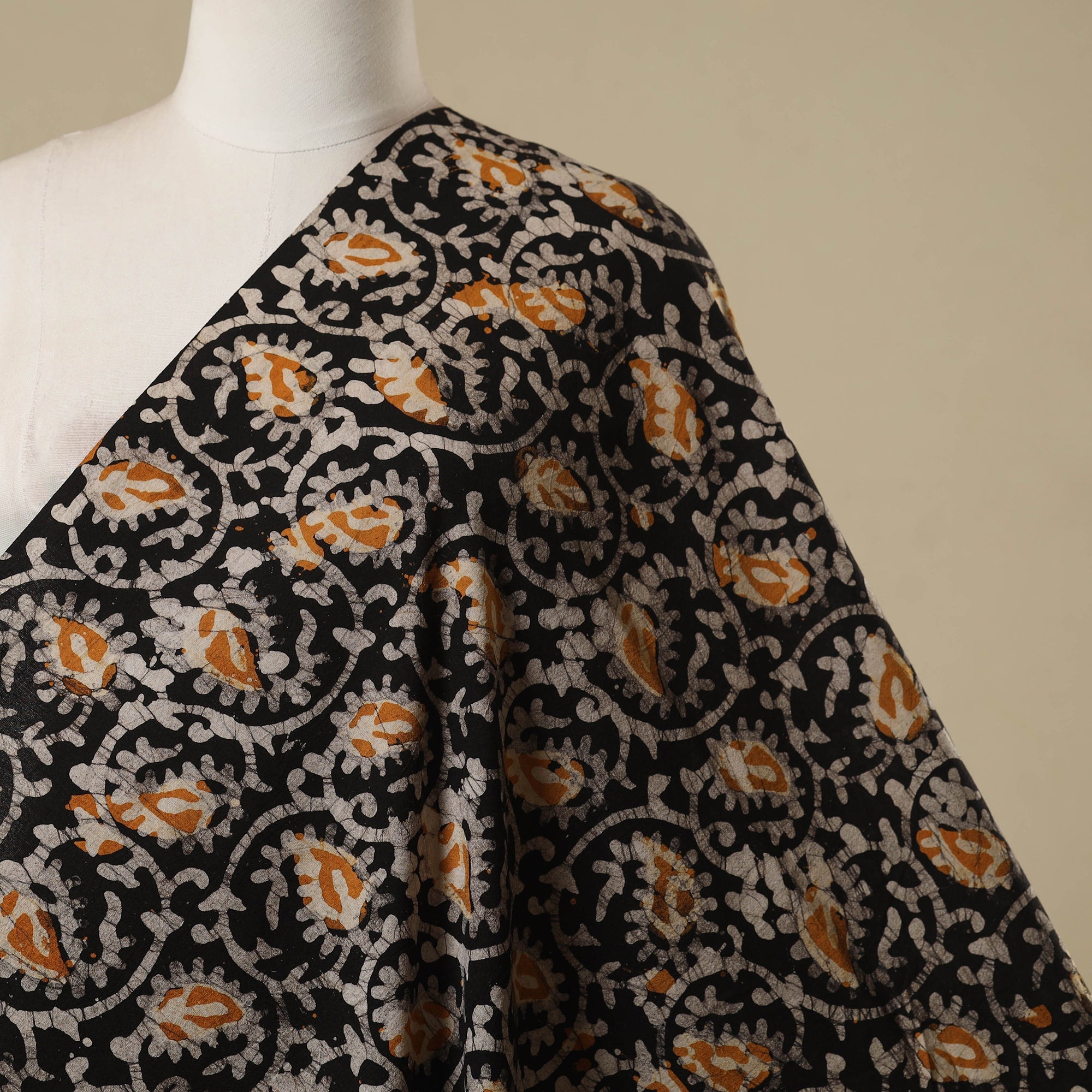 Black hand block batik print cotton fabric from Kutch, Gujarat is crafted using the traditional wax-resist dyeing technique, where hot wax is carefully applied before dyeing to achieve intricate patterns. The cotton base offers dependable durability and everyday comfort, making it versatile for ethnic outfits, relaxed casual wear and creative home decor ideas.