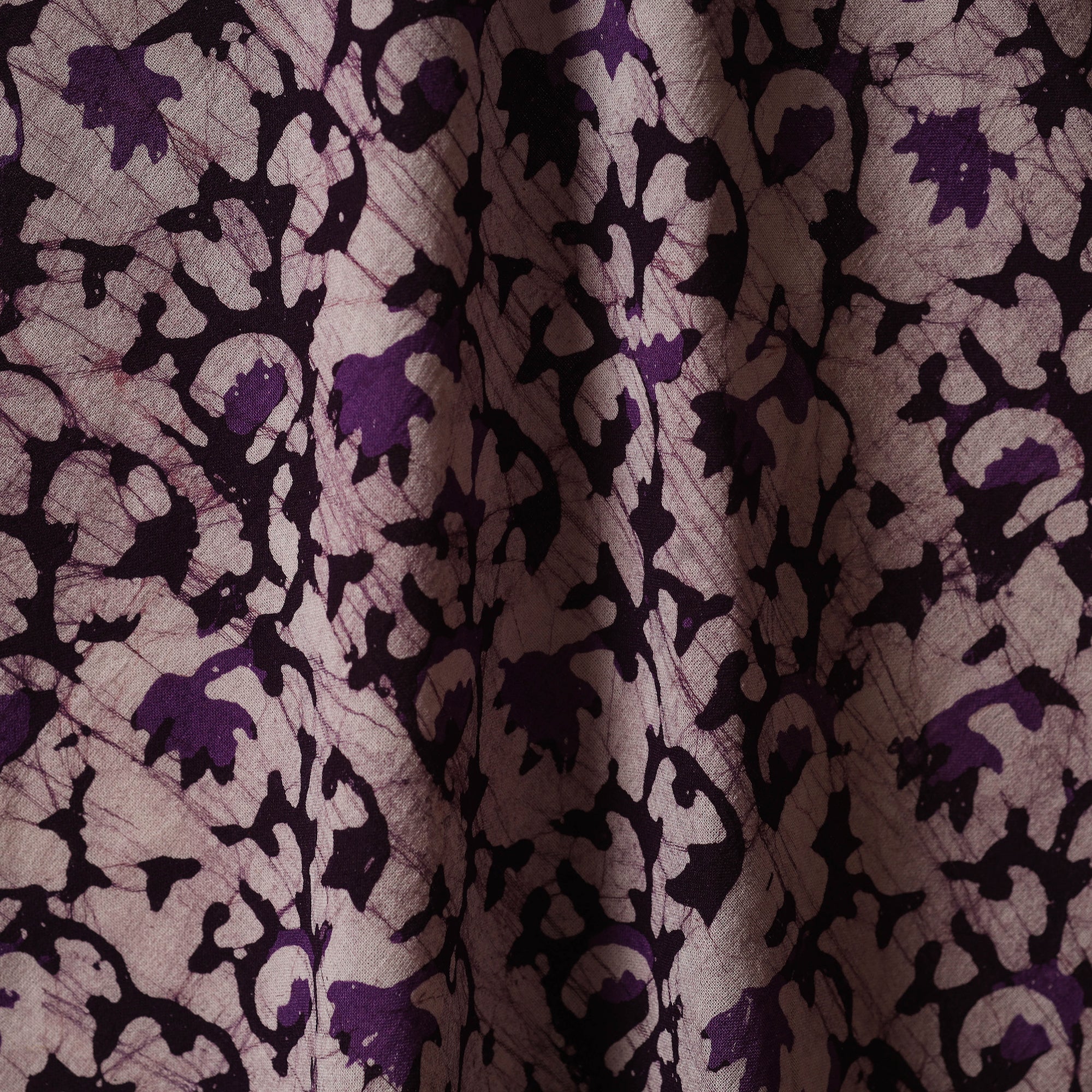 Purple hand block batik print cotton fabric from Kutch, Gujarat is crafted using the traditional wax-resist dyeing technique, where hot wax is carefully applied before dyeing to achieve intricate patterns. The cotton base offers dependable durability and everyday comfort, making it versatile for ethnic outfits, relaxed casual wear and creative home decor ideas.