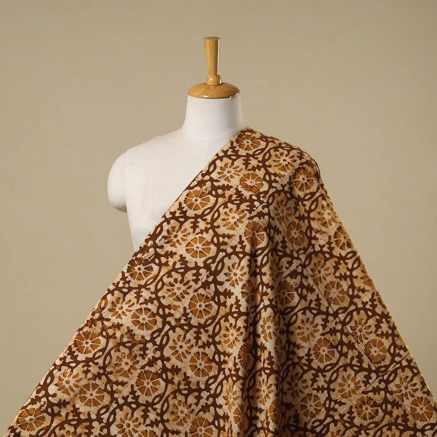 Brown hand block batik print cotton fabric from Kutch, Gujarat is crafted using the traditional wax-resist dyeing technique, where hot wax is carefully applied before dyeing to achieve intricate patterns. The cotton base offers dependable durability and everyday comfort, making it versatile for ethnic outfits, relaxed casual wear and creative home decor ideas.