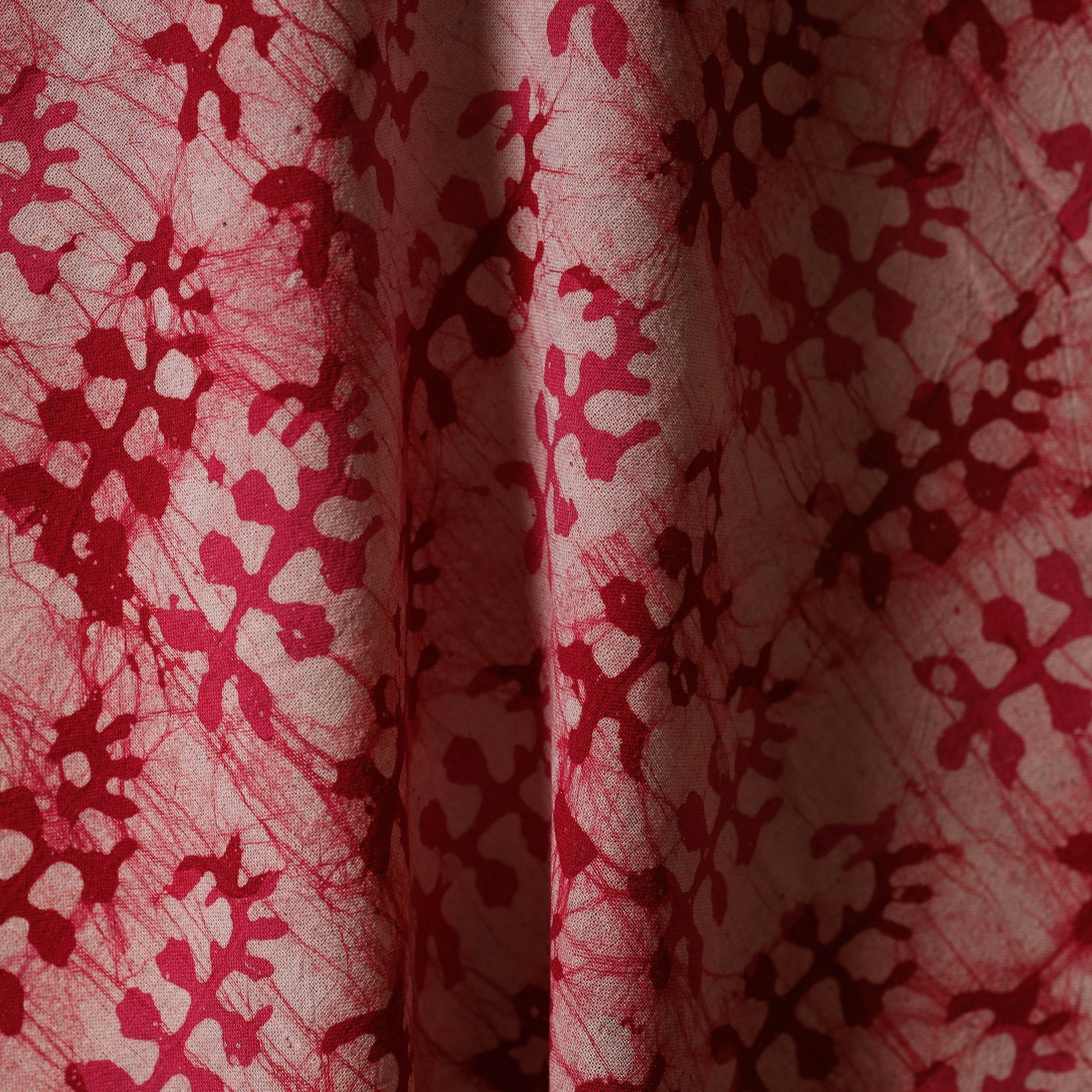 Pink hand block batik print cotton fabric from Kutch, Gujarat is crafted using the traditional wax-resist dyeing technique, where hot wax is carefully applied before dyeing to achieve intricate patterns. The cotton base offers dependable durability and everyday comfort, making it versatile for ethnic outfits, relaxed casual wear and creative home decor ideas.