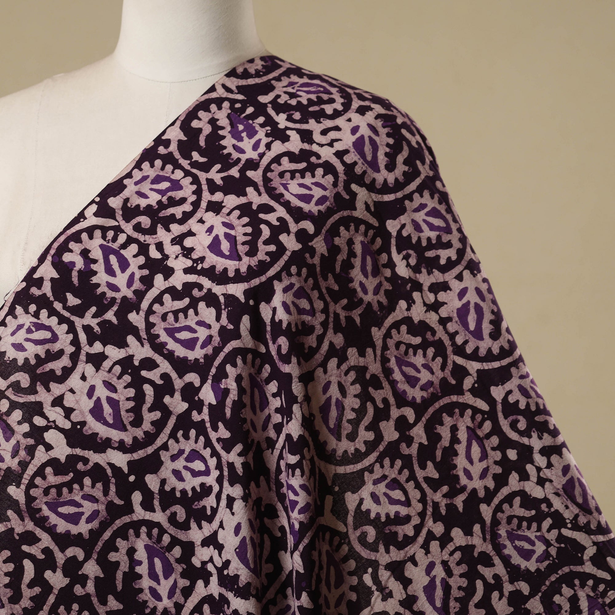Purple hand block batik print cotton fabric from Kutch, Gujarat is crafted using the traditional wax-resist dyeing technique, where hot wax is carefully applied before dyeing to achieve intricate patterns. The cotton base offers dependable durability and everyday comfort, making it versatile for ethnic outfits, relaxed casual wear and creative home decor ideas.