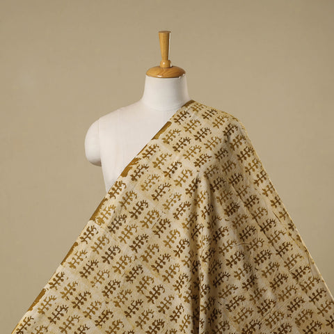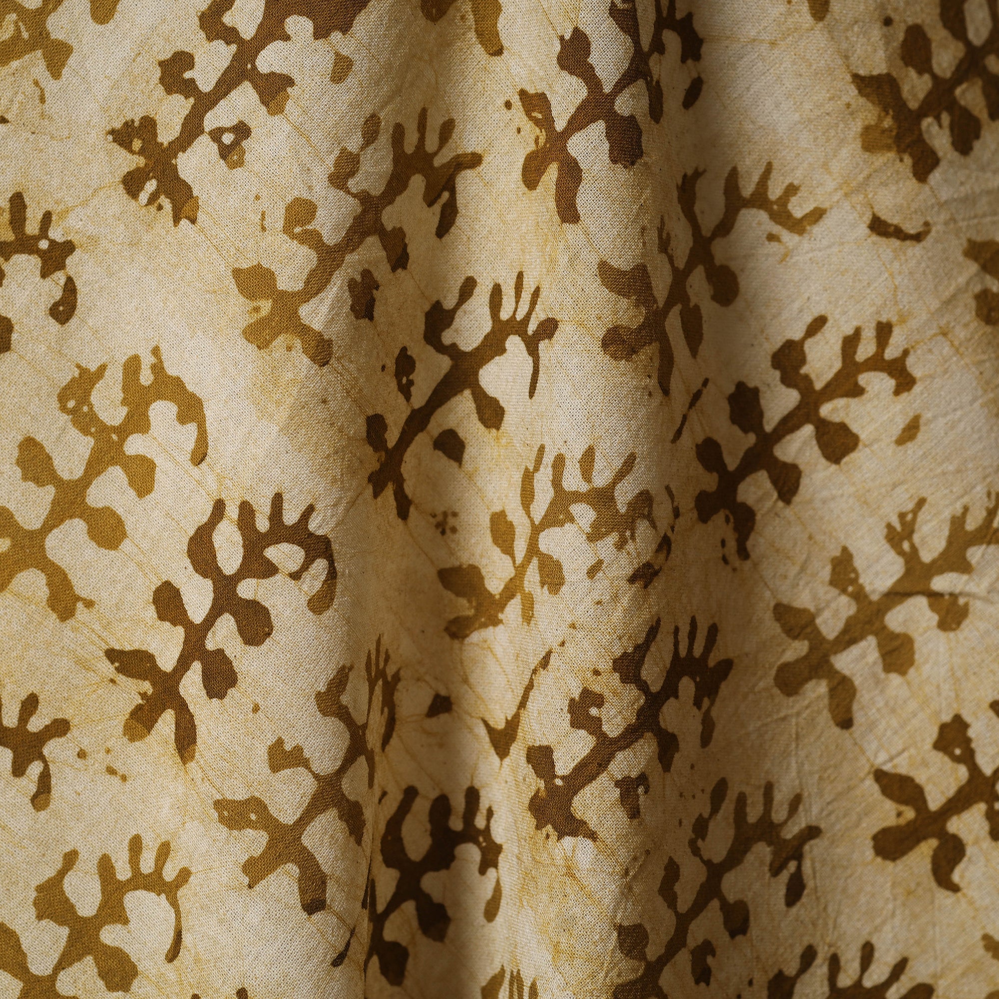 Beige hand block batik print cotton fabric from Kutch, Gujarat is crafted using the traditional wax-resist dyeing technique, where hot wax is carefully applied before dyeing to achieve intricate patterns. The cotton base offers dependable durability and everyday comfort, making it versatile for ethnic outfits, relaxed casual wear and creative home decor ideas.