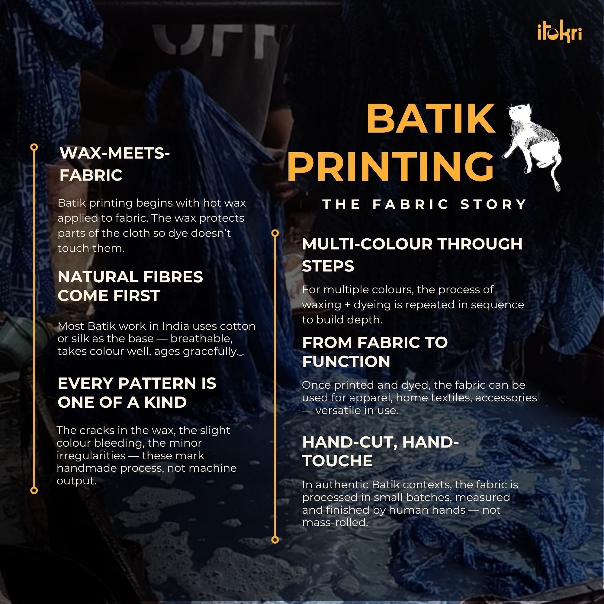 Batik is a very famous technique of wax-resist dyeing applied to whole cloth. The traditional designs and motifs in Indian batik are exceptional. It is a type of resist printing process wherein wax is applied to the fabric in specific areas.