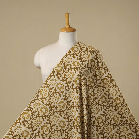 Brown hand block batik print cotton fabric from Kutch, Gujarat is crafted using the traditional wax-resist dyeing technique, where hot wax is carefully applied before dyeing to achieve intricate patterns. The cotton base offers dependable durability and everyday comfort, making it versatile for ethnic outfits, relaxed casual wear and creative home decor ideas.