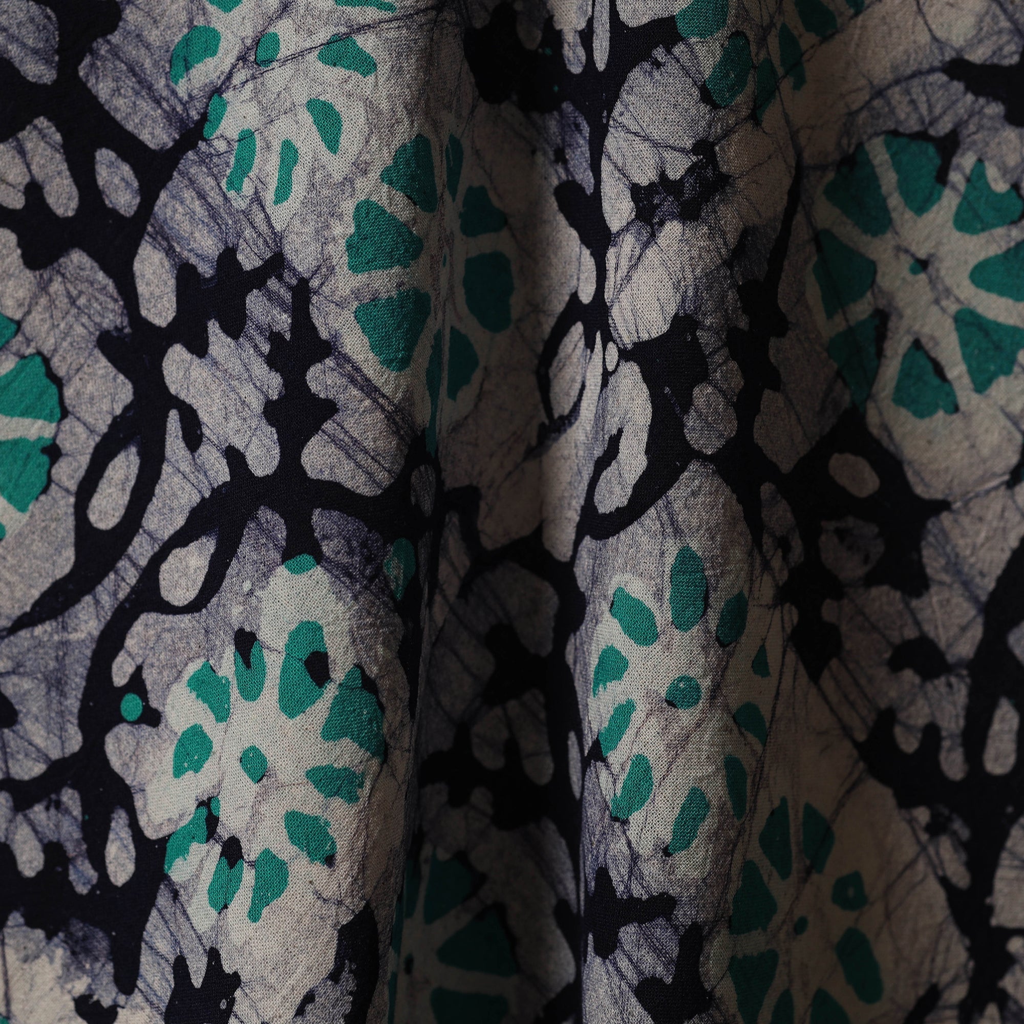 Blue hand block batik print cotton fabric from Kutch, Gujarat is crafted using the traditional wax-resist dyeing technique, where hot wax is carefully applied before dyeing to achieve intricate patterns. The cotton base offers dependable durability and everyday comfort, making it versatile for ethnic outfits, relaxed casual wear and creative home decor ideas.