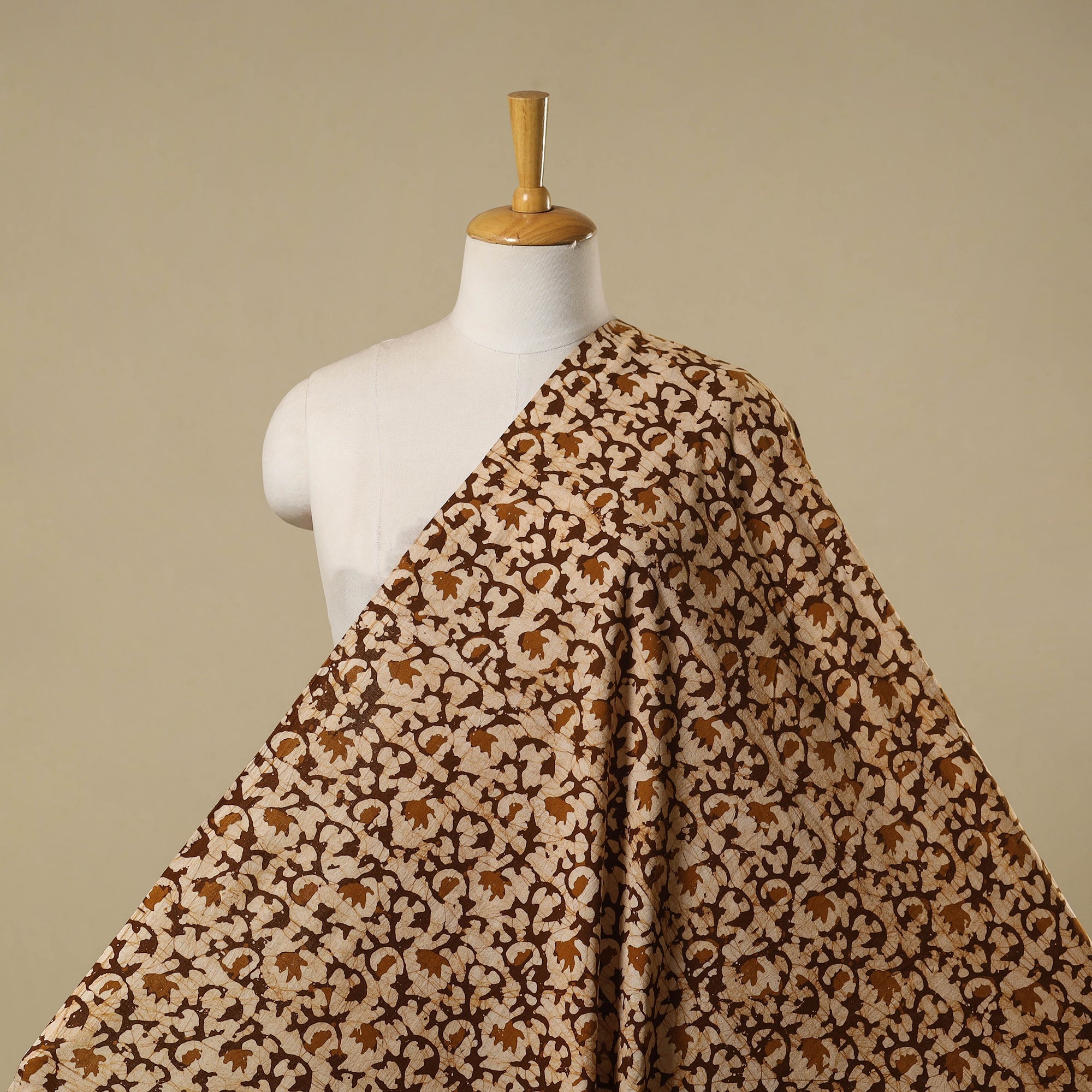 Beige hand block batik print cotton fabric from Kutch, Gujarat is crafted using the traditional wax-resist dyeing technique, where hot wax is carefully applied before dyeing to achieve intricate patterns. The cotton base offers dependable durability and everyday comfort, making it versatile for ethnic outfits, relaxed casual wear and creative home decor ideas.