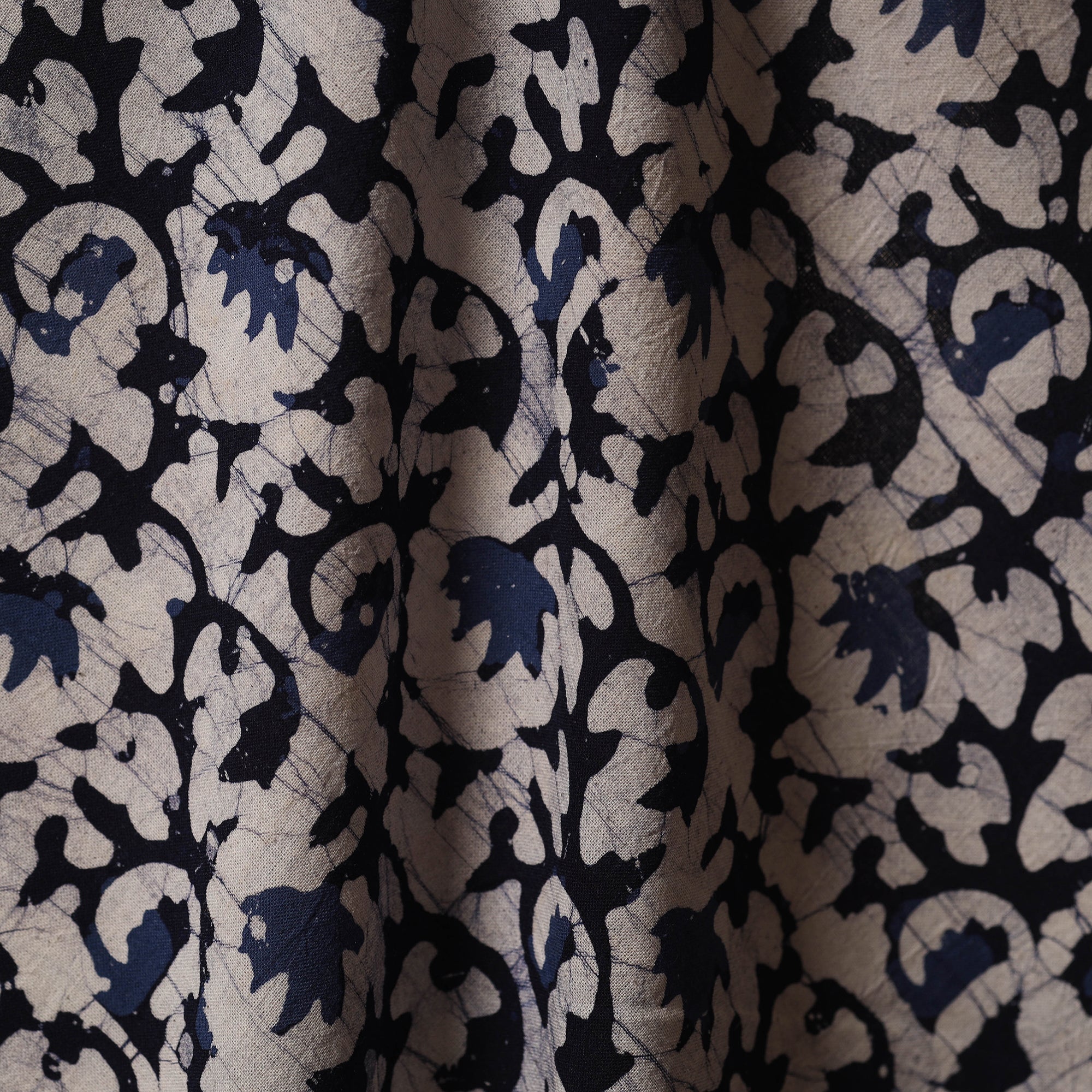Blue hand block batik print cotton fabric from Kutch, Gujarat is crafted using the traditional wax-resist dyeing technique, where hot wax is carefully applied before dyeing to achieve intricate patterns. The cotton base offers dependable durability and everyday comfort, making it versatile for ethnic outfits, relaxed casual wear and creative home decor ideas.