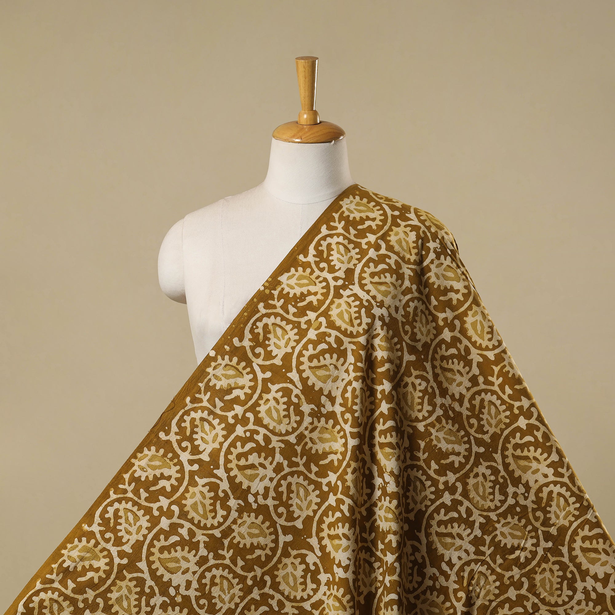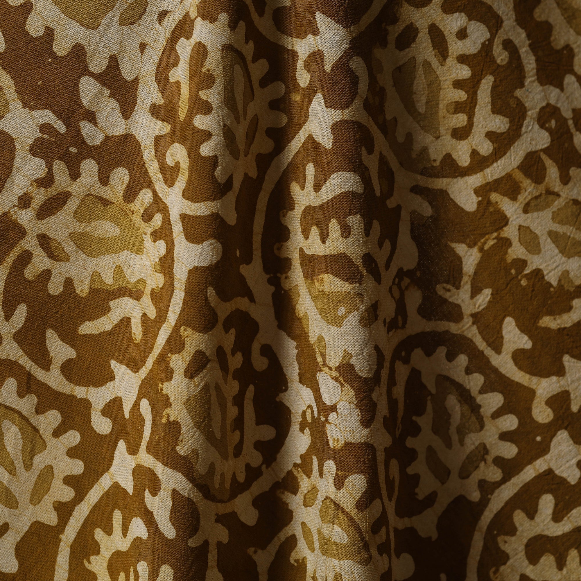 Brown hand block batik print cotton fabric from Kutch, Gujarat is crafted using the traditional wax-resist dyeing technique, where hot wax is carefully applied before dyeing to achieve intricate patterns. The cotton base offers dependable durability and everyday comfort, making it versatile for ethnic outfits, relaxed casual wear and creative home decor ideas.