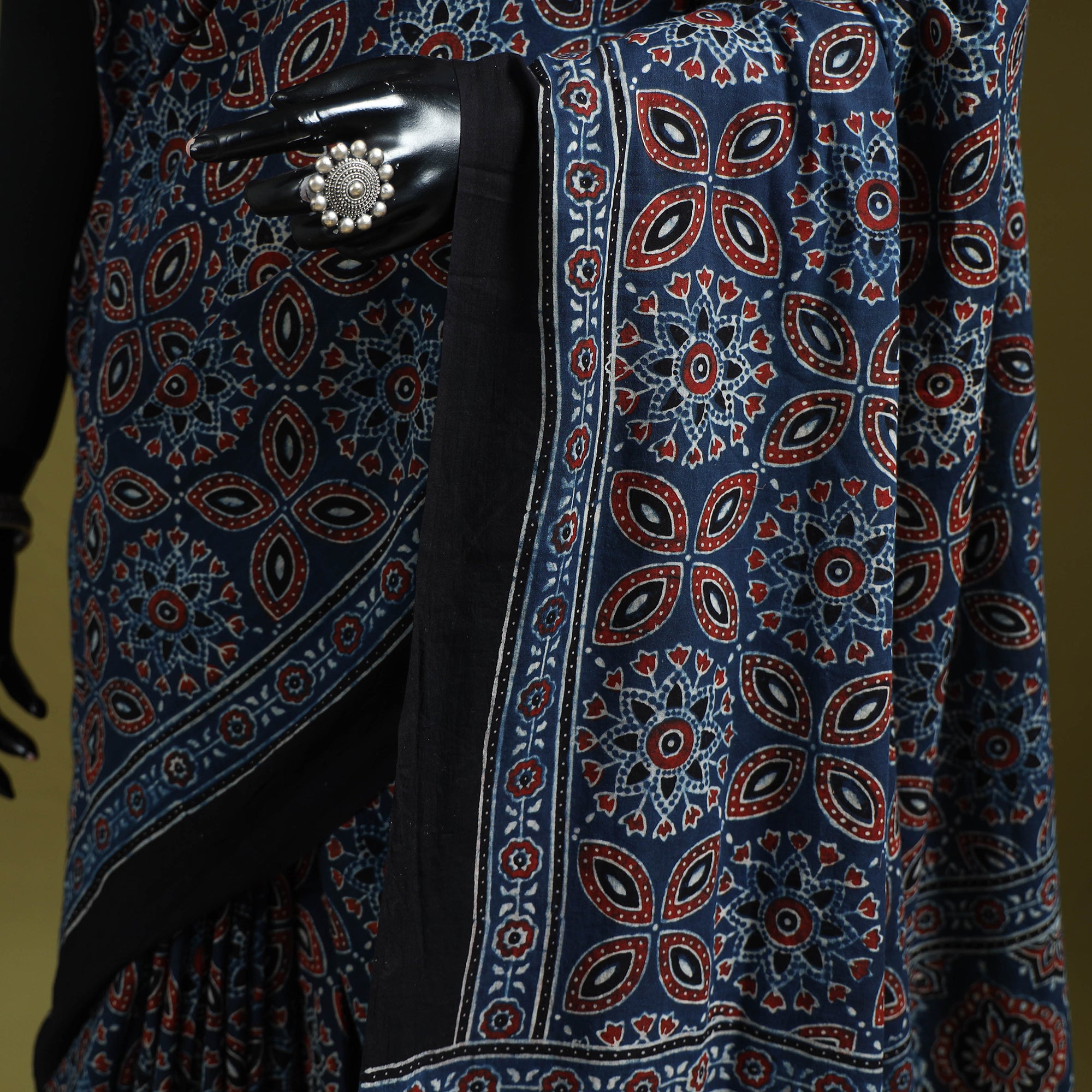 This traditional Ajrakh saree is block printed by artisan Tausif Khatri using natural dyes and carved wooden blocks. Originating from the Kutch region of Gujarat, ajrakh printing is known for its symmetrical geometric motifs and multi-stage dyeing process. Crafted in fine mul cotton, the saree is finished with decorative tassels. Suitable for festive events, cultural celebrations, and refined everyday wear.
