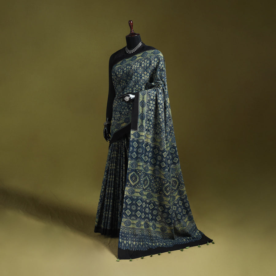 • Kutch Hand Block Print Natural Dyed Pure Mul Cotton Ajrakh Saree with Tassels 07