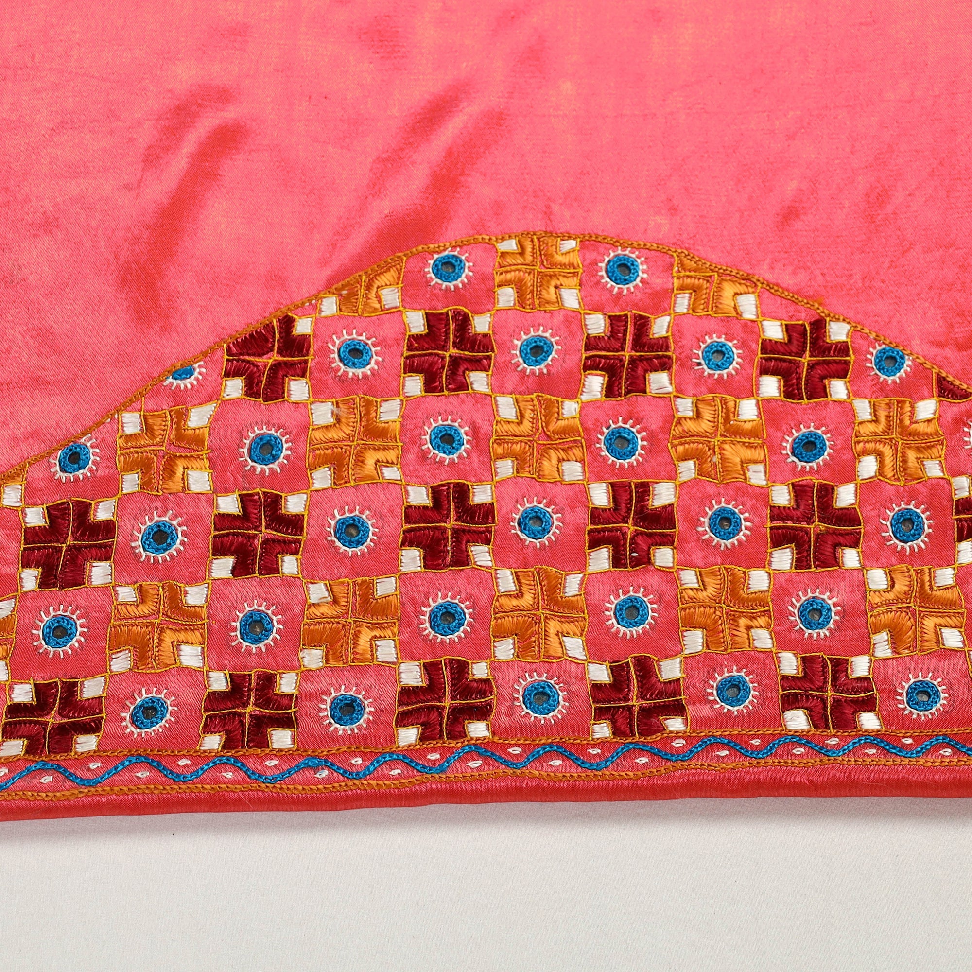 This peach kutch hand embroidery mashru silk blouse piece is adorned with intricate vibrant embroidery by skilled artisans of Kutch. The rich sheen of mashru silk, combined with detailed hand embroidery, creates an elegant blend of tradition making it a perfect choice for sarees and festive ensembles.