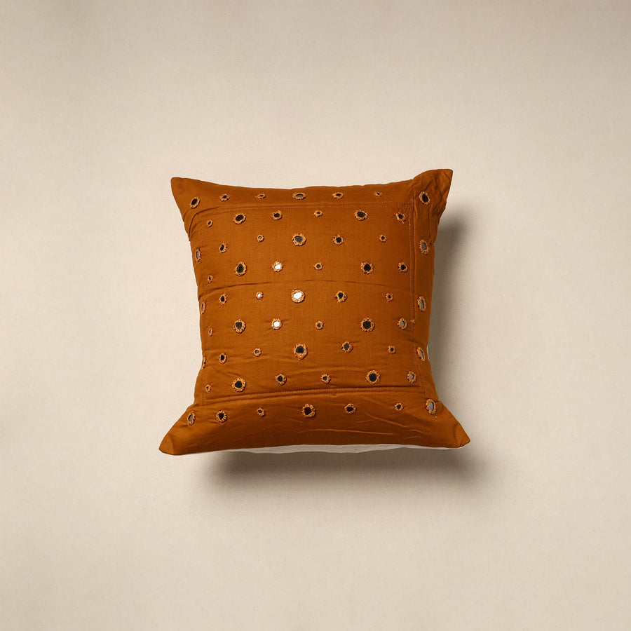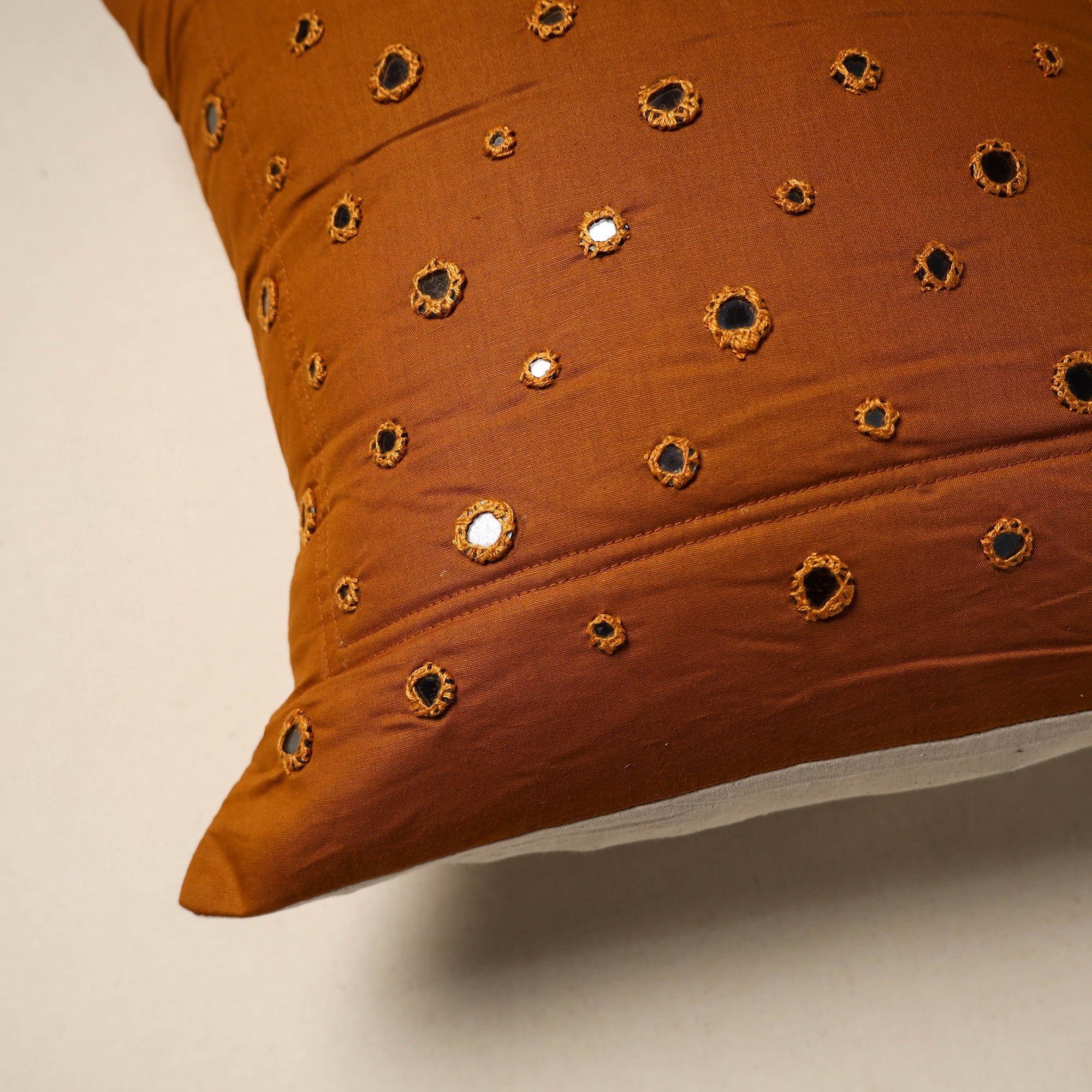 Brown kutch hand embroidery mirror work quilted cushion cover is made from cotton. It brings bright colour, light texture and a traditional touch to any living space. Easy to use and maintain, it works well on sofas, beds or chairs.