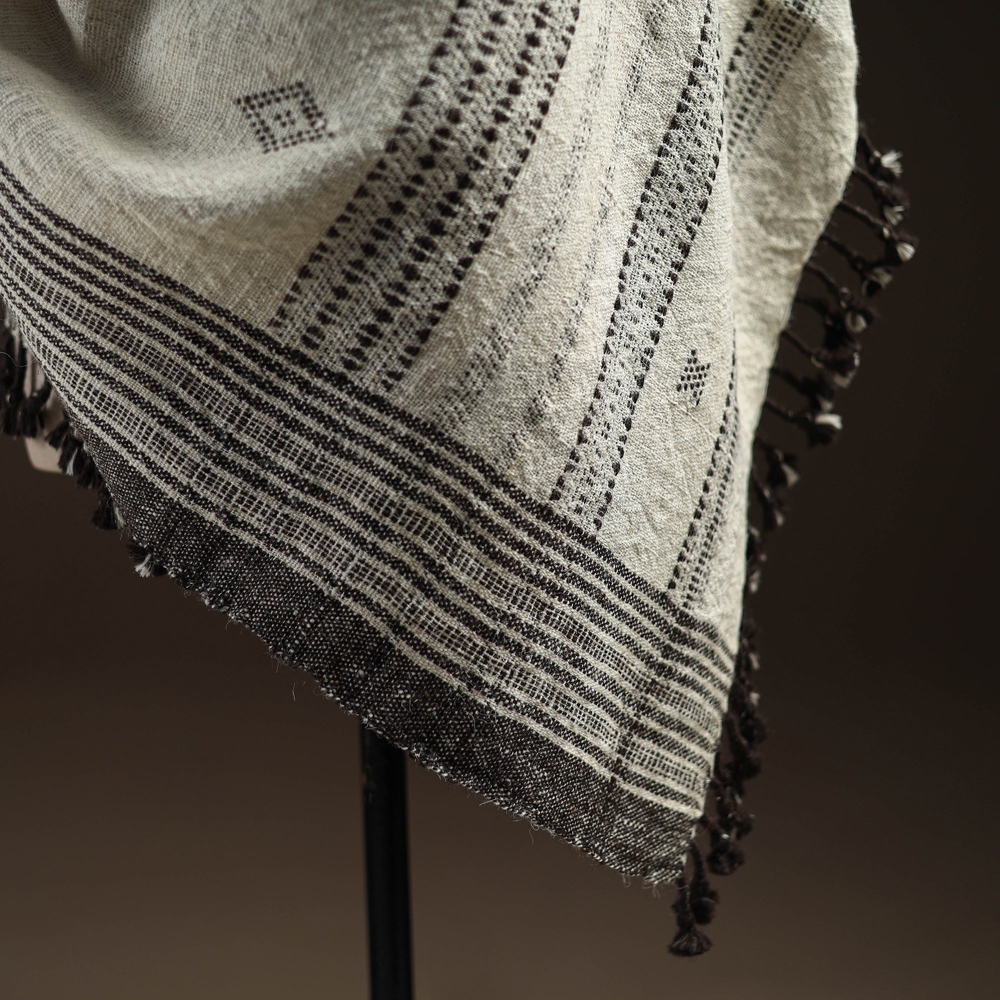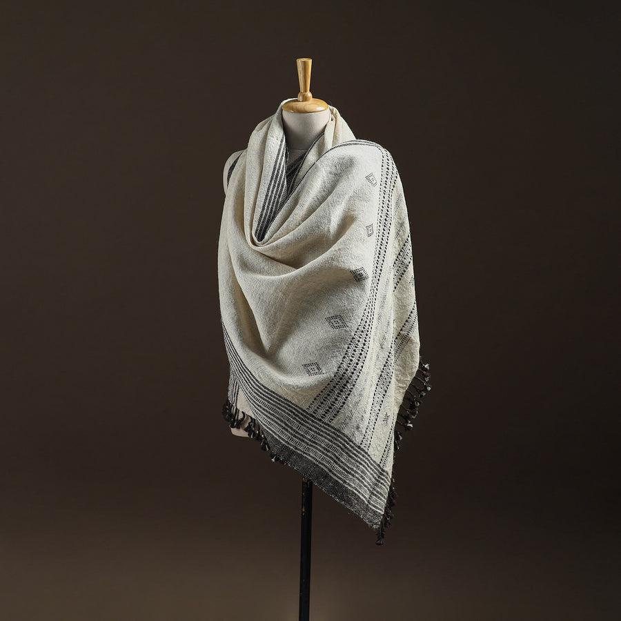 Kutch handspun handwoven shawl crafted by skilled artisan Vankar Bhimji Kanji from Bhuj Gujarat. Adorned with intricate Kutchi motifs and tassle. Made from desi sheep wool it offers both warmth and comfort. A perfect blend of tradition and style ideal for daily winter wear.