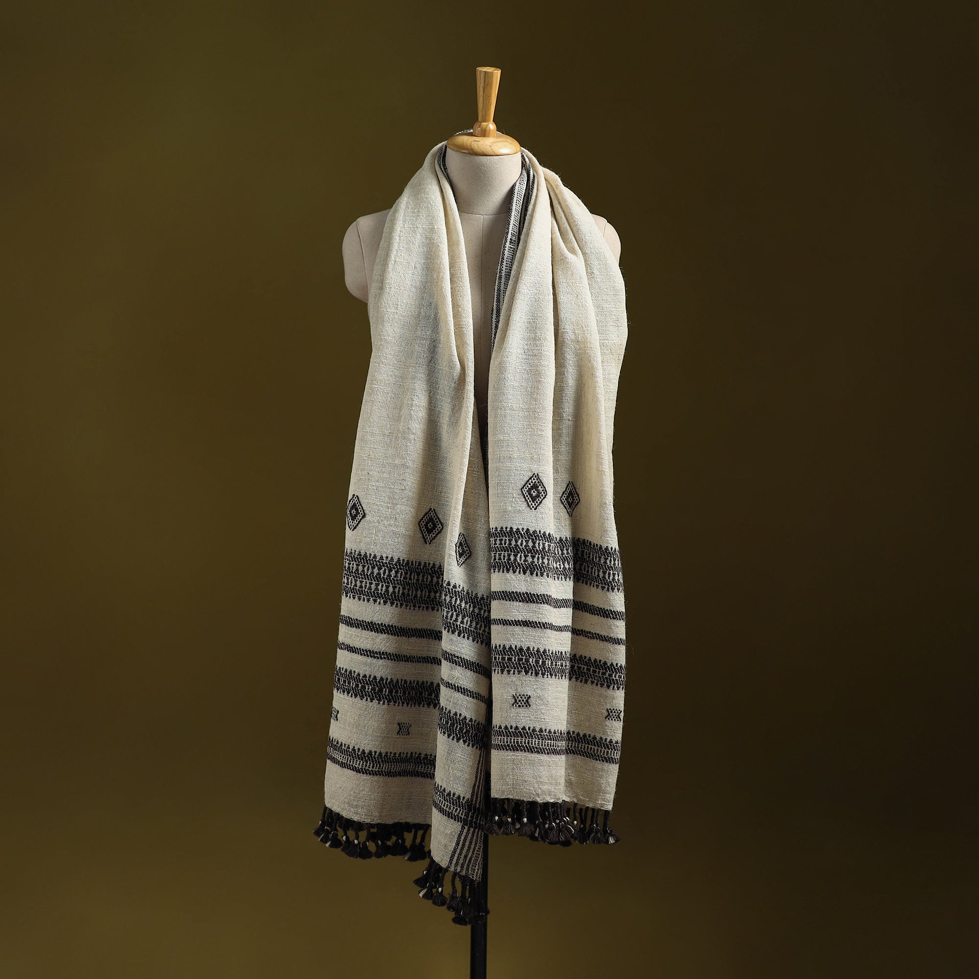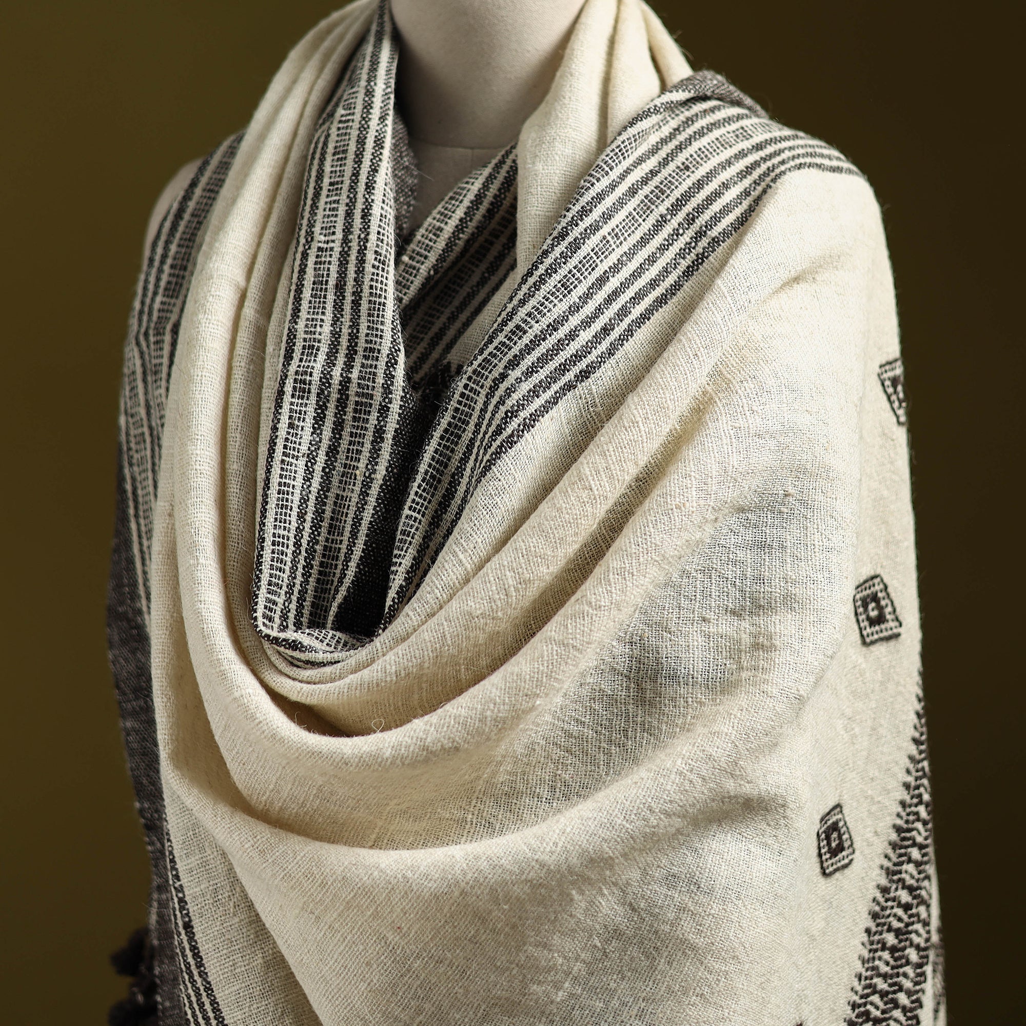 White kutch handspun handwoven shawl crafted by skilled artisan Vankar Bhimji Kanji from Bhuj Gujarat. Adorned with intricate Kutchi motifs and tassle. Made from desi sheep wool it offers both warmth and comfort. A perfect blend of tradition and style ideal for daily winter wear.