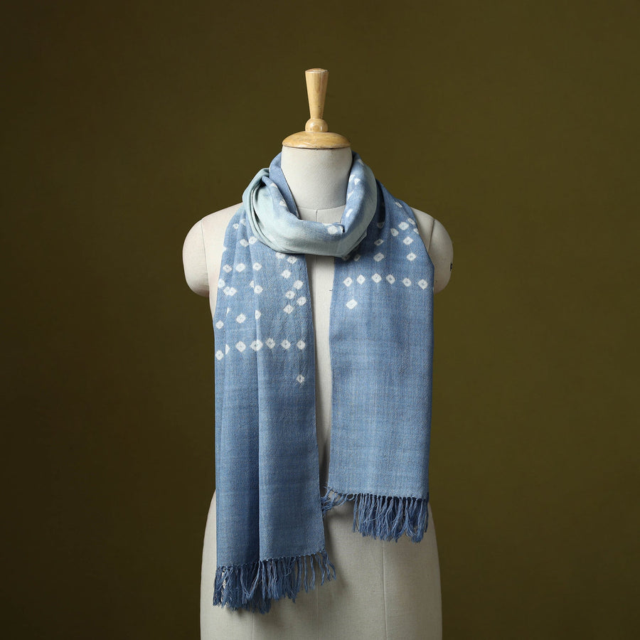 Blue handwoven bagida bandhani tie-dye merino wool stole featuring tassels and showcasing the artistry of Kutch, Gujarat. Crafted by skilled artisan Vankar Bhimji Kanji, it blends traditional charm with a contemporary touch. It adds grace to both everyday outfits and festive looks while offering comforting warmth, making it a beautiful choice for chilly days.