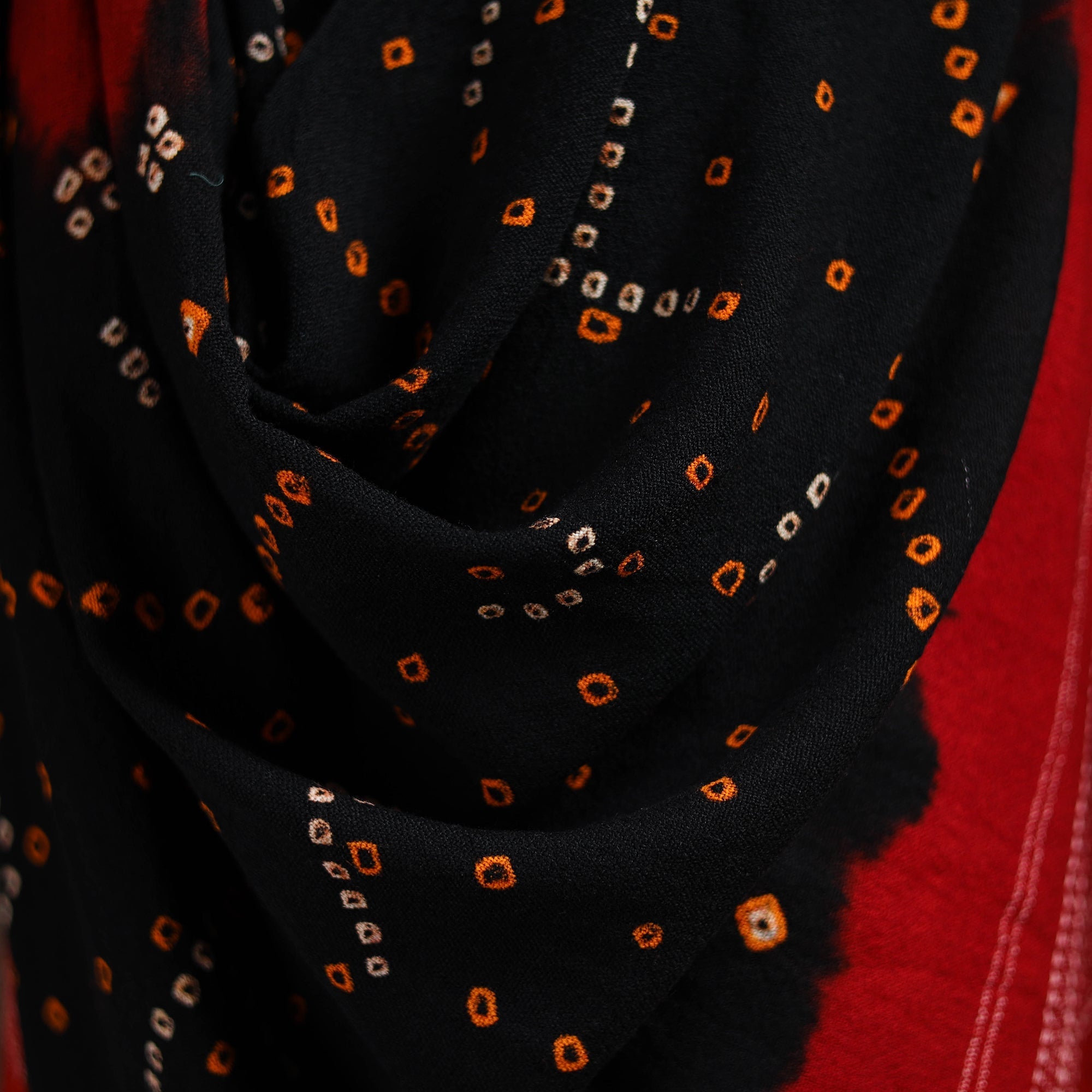 Black handwoven bandhani tie-dye merino wool shawl, thoughtfully created by skilled artisans from Kutch, Gujarat, blends traditional charm with a contemporary touch. It adds grace to both everyday outfits and festive looks while offering comforting warmth, making it a beautiful choice for chilly days.