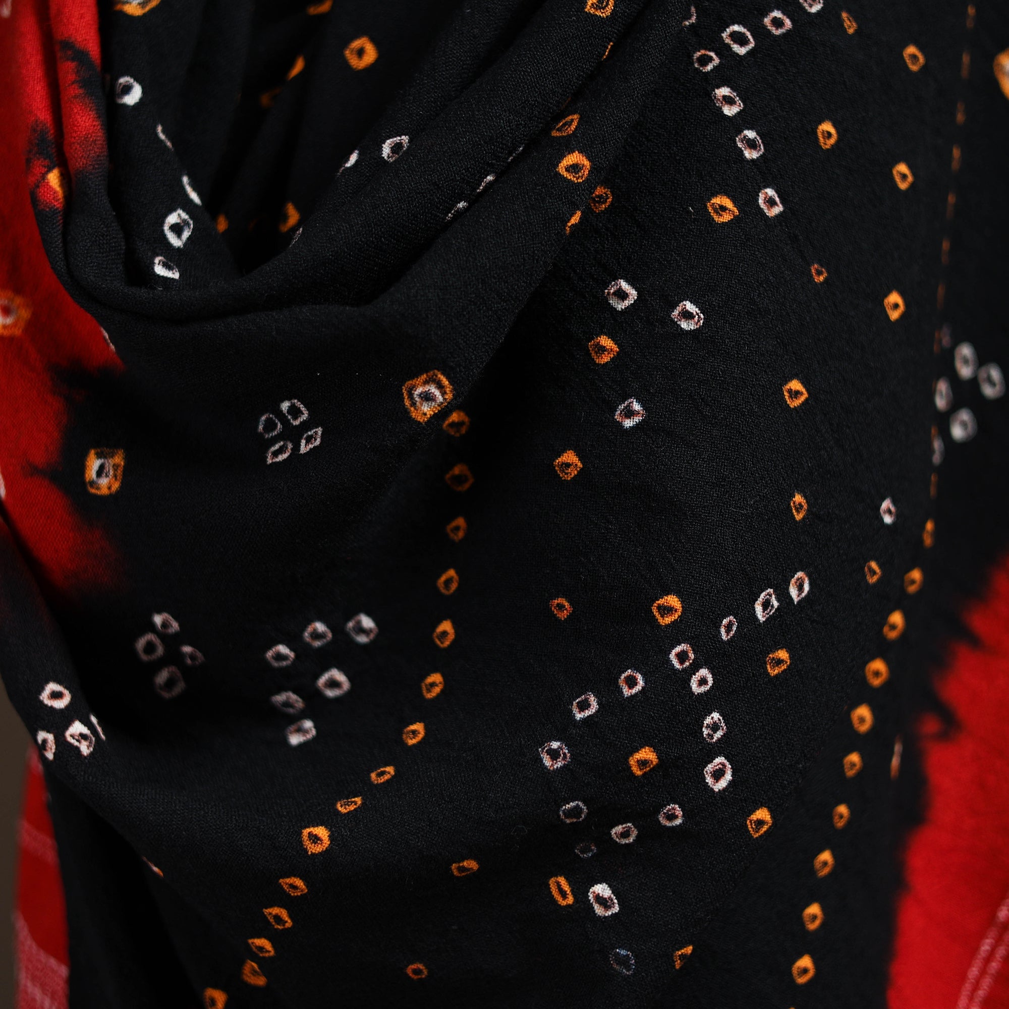 Handwoven bandhani tie-dye merino wool shawl, thoughtfully created by skilled artisans from Kutch, Gujarat, blends traditional charm with a contemporary touch. It adds grace to both everyday outfits and festive looks while offering comforting warmth, making it a beautiful choice for chilly days.