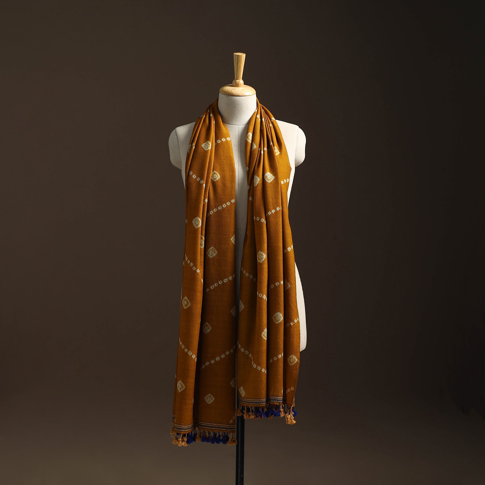 Yellow handwoven bandhani tie-dye fine woolen shawl features a tassels and carries the artistry of Kutch, Gujarat. Crafted skilled artisans by Vankar Bhimji Kanji, it blends traditional charm with a contemporary feel. It adds a graceful touch to your everyday look or festive ensemble, and also offers comforting warmth, making it a lovely choice for chilly days.