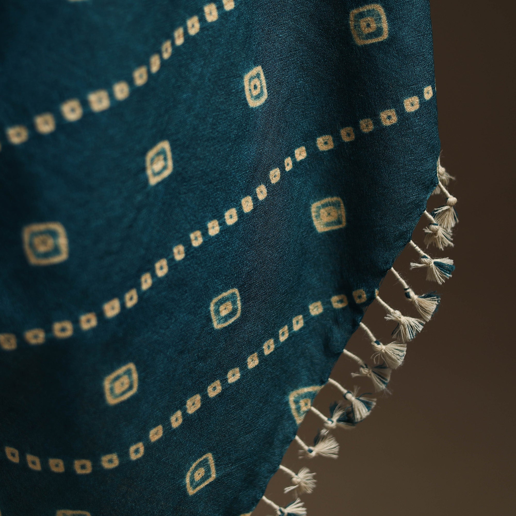 Blue handwoven bandhani tie-dye fine woolen shawl features a tassels and carries the artistry of Kutch, Gujarat. Crafted skilled artisans by Vankar Bhimji Kanji, it blends traditional charm with a contemporary feel. It adds a graceful touch to your everyday look or festive ensemble, and also offers comforting warmth, making it a lovely choice for chilly days.