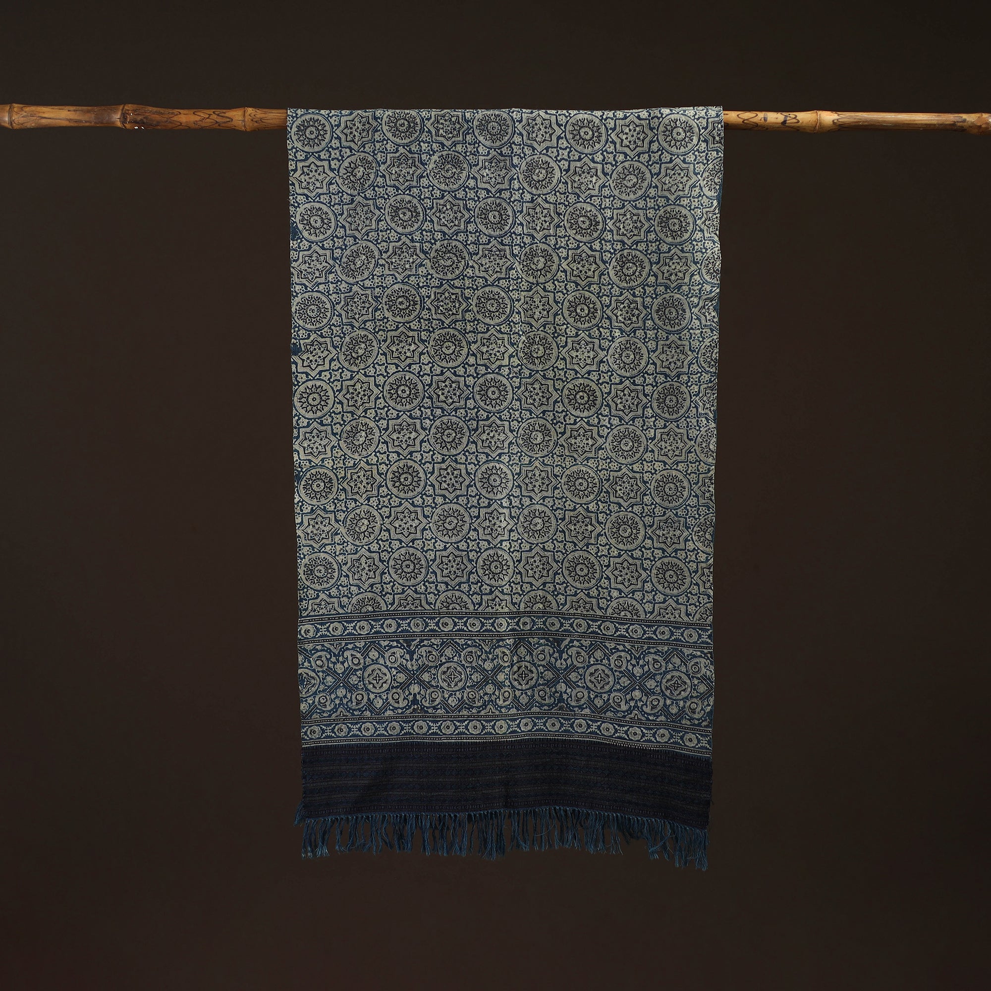 Blue handwoven ajrakh stole with tassels crafted by Vankar Bhimji Kanji from Kutch. Made using natural dyeing and resist block-printing techniques, a tradition believed to be over 4,500 years old. Crafted from merino wool, it offers dependable warmth, perfect for chilly days. Ideal for everyday use, travel, thoughtful gifting or adding a artisanal flair to your special outfits.