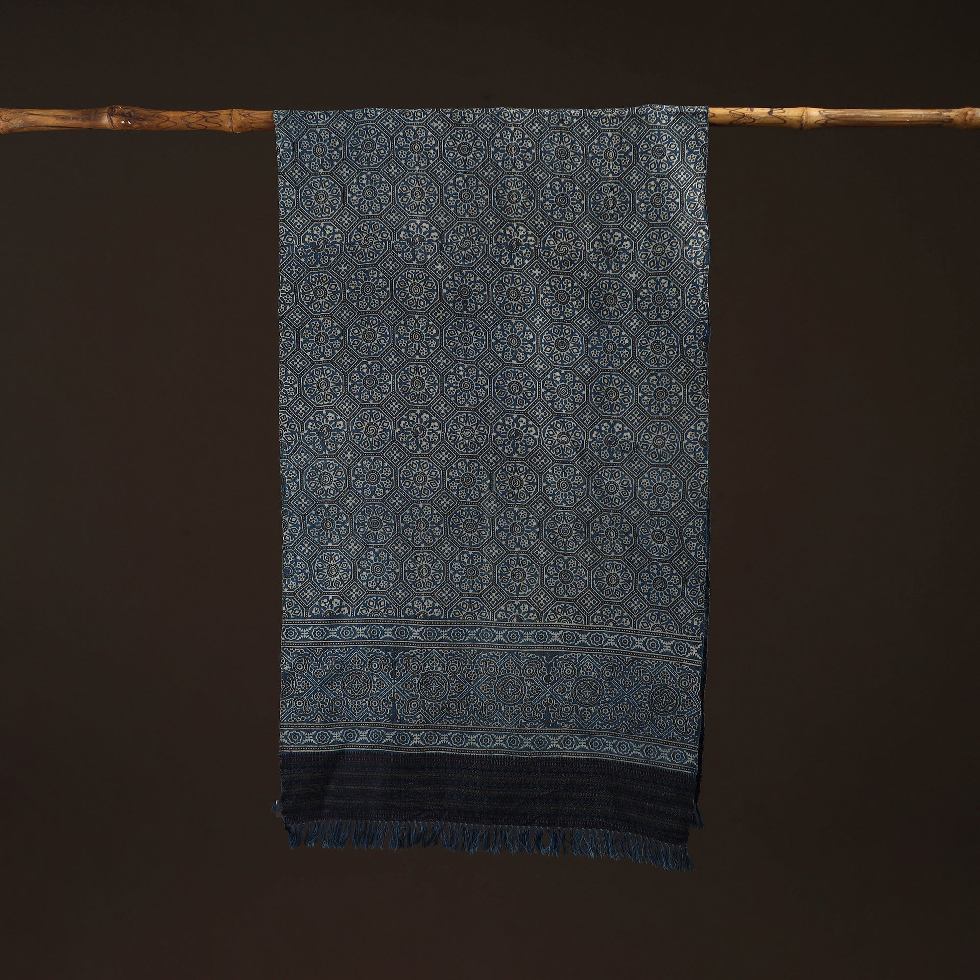 Blue handwoven ajrakh stole with tassels crafted by Vankar Bhimji Kanji from Kutch. Made using natural dyeing and resist block-printing techniques, a tradition believed to be over 4,500 years old. Crafted from merino wool, it offers dependable warmth, perfect for chilly days. Ideal for everyday use, travel, thoughtful gifting or adding a artisanal flair to your special outfits.
