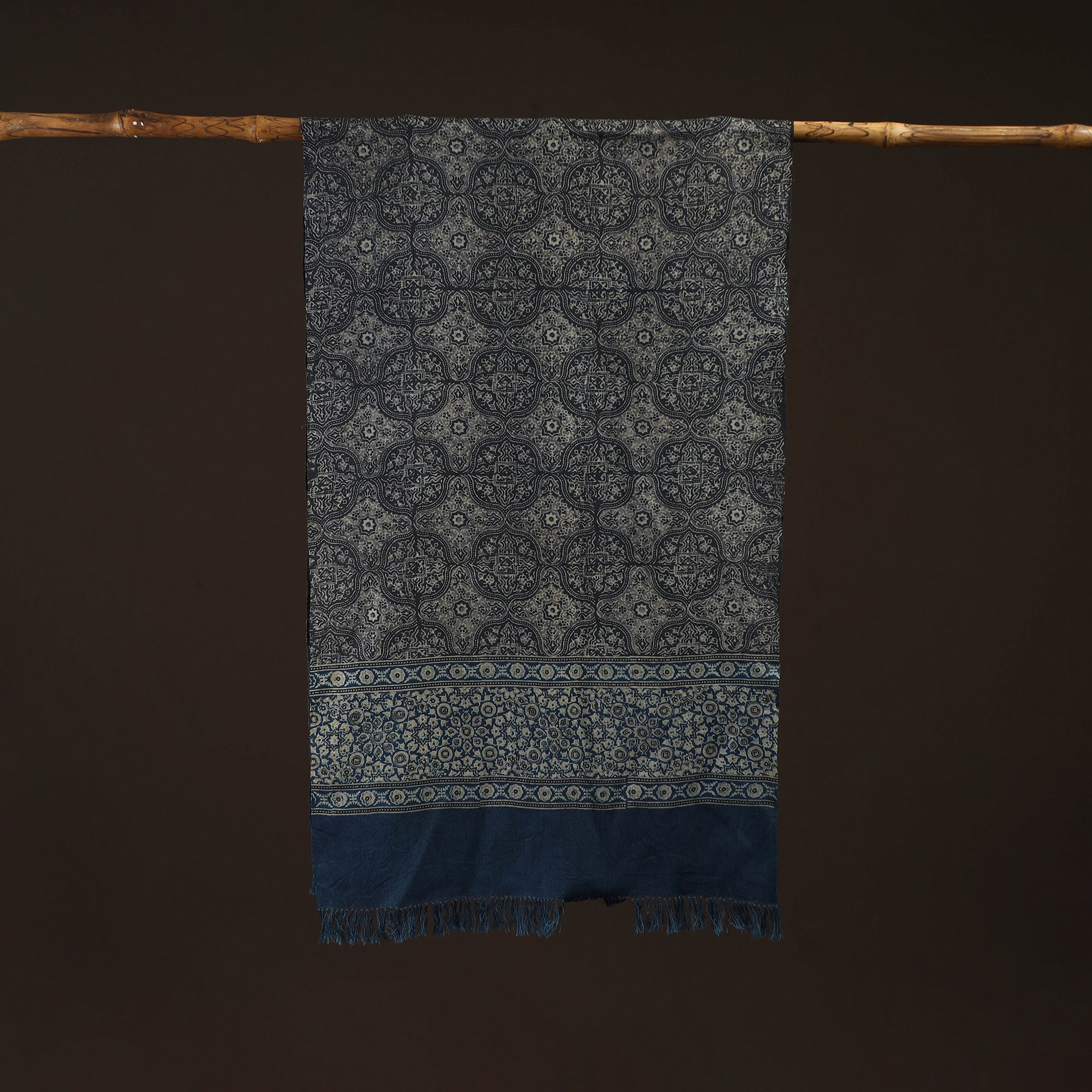 Handwoven ajrakh stole with tassels crafted by Vankar Bhimji Kanji from Kutch. Made using natural dyeing and resist block-printing techniques, a tradition believed to be over 4,500 years old. Crafted from merino wool, it offers dependable warmth, perfect for chilly days. Ideal for everyday use, travel, thoughtful gifting or adding a artisanal flair to your special outfits.