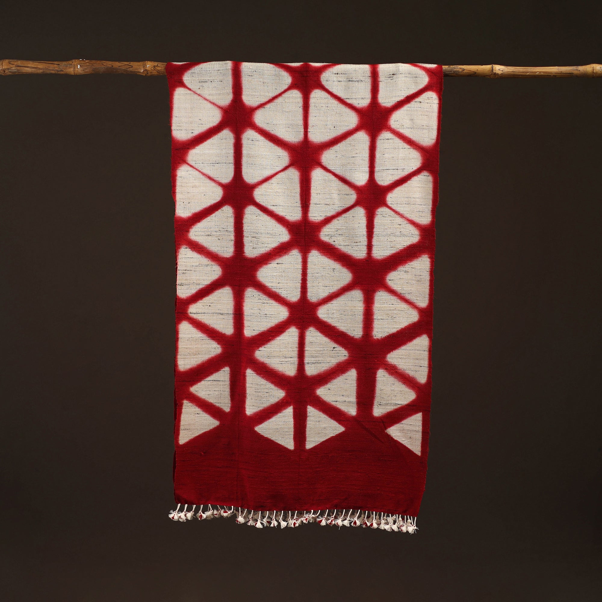 Handwoven shibori stole with tassels crafted by Vankar Bhimji Kanji from Kutch. Made using clamp-dyed techniques. Crafted from merino wool x katia silk, it offers dependable warmth, perfect for chilly days. Ideal for everyday use, travel, thoughtful gifting or adding a artisanal flair to your special outfits.