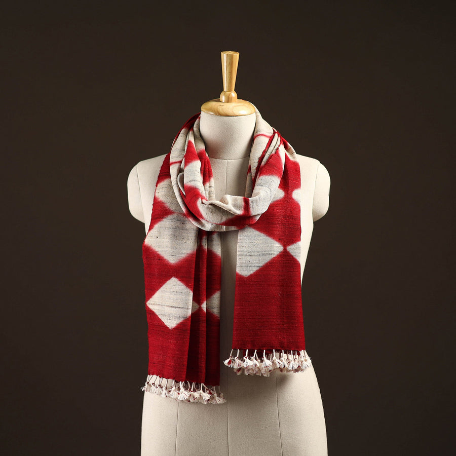 Handwoven shibori stole with tassels crafted by Vankar Bhimji Kanji from Kutch. Made using clamp-dyed techniques. Crafted from merino wool x katia silk, it offers dependable warmth, perfect for chilly days. Ideal for everyday use, travel, thoughtful gifting or adding a artisanal flair to your special outfits.