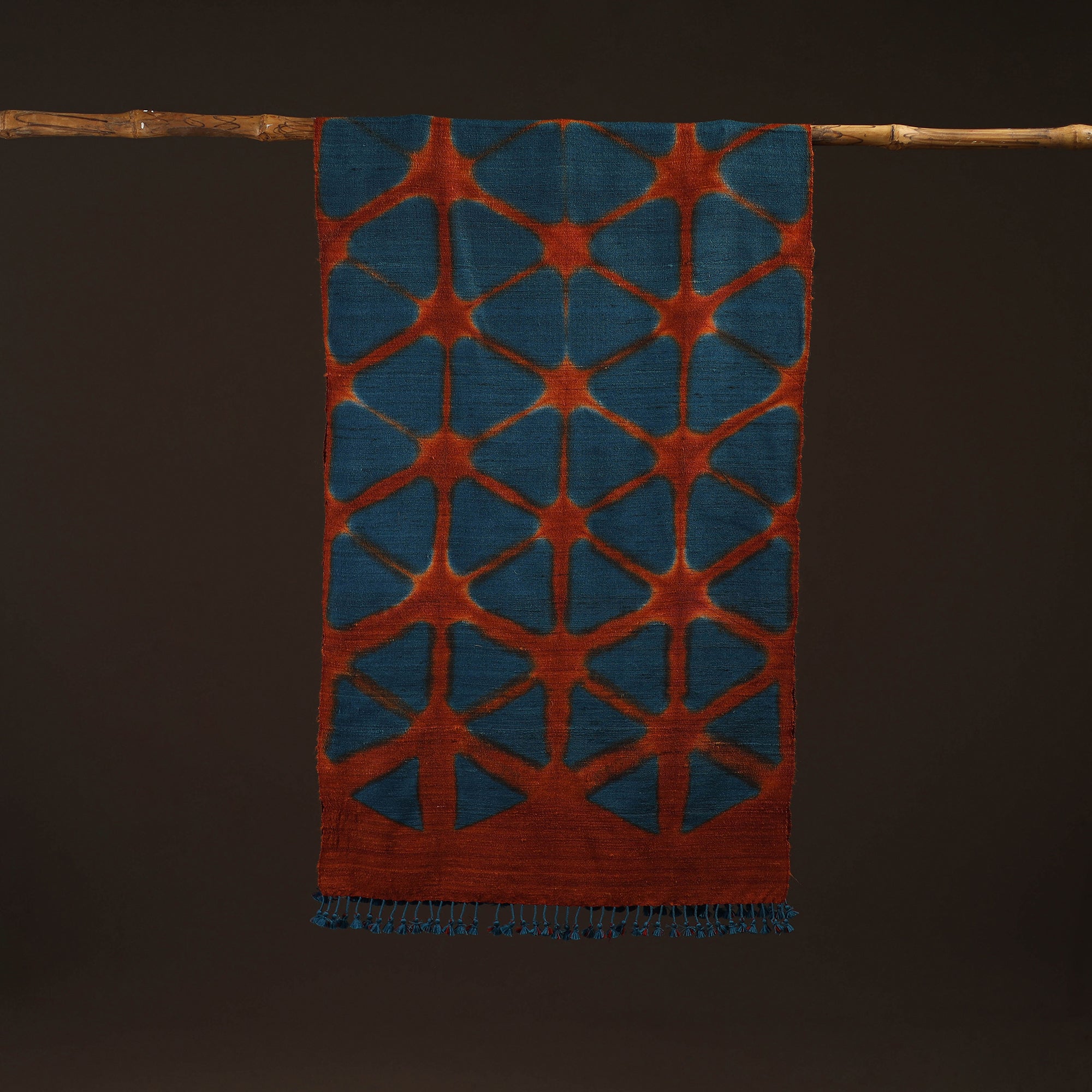 Handwoven shibori stole with tassels crafted by Vankar Bhimji Kanji from Kutch. Made using clamp-dyed techniques. Crafted from merino wool x katia silk, it offers dependable warmth, perfect for chilly days. Ideal for everyday use, travel, thoughtful gifting or adding a artisanal flair to your special outfits.