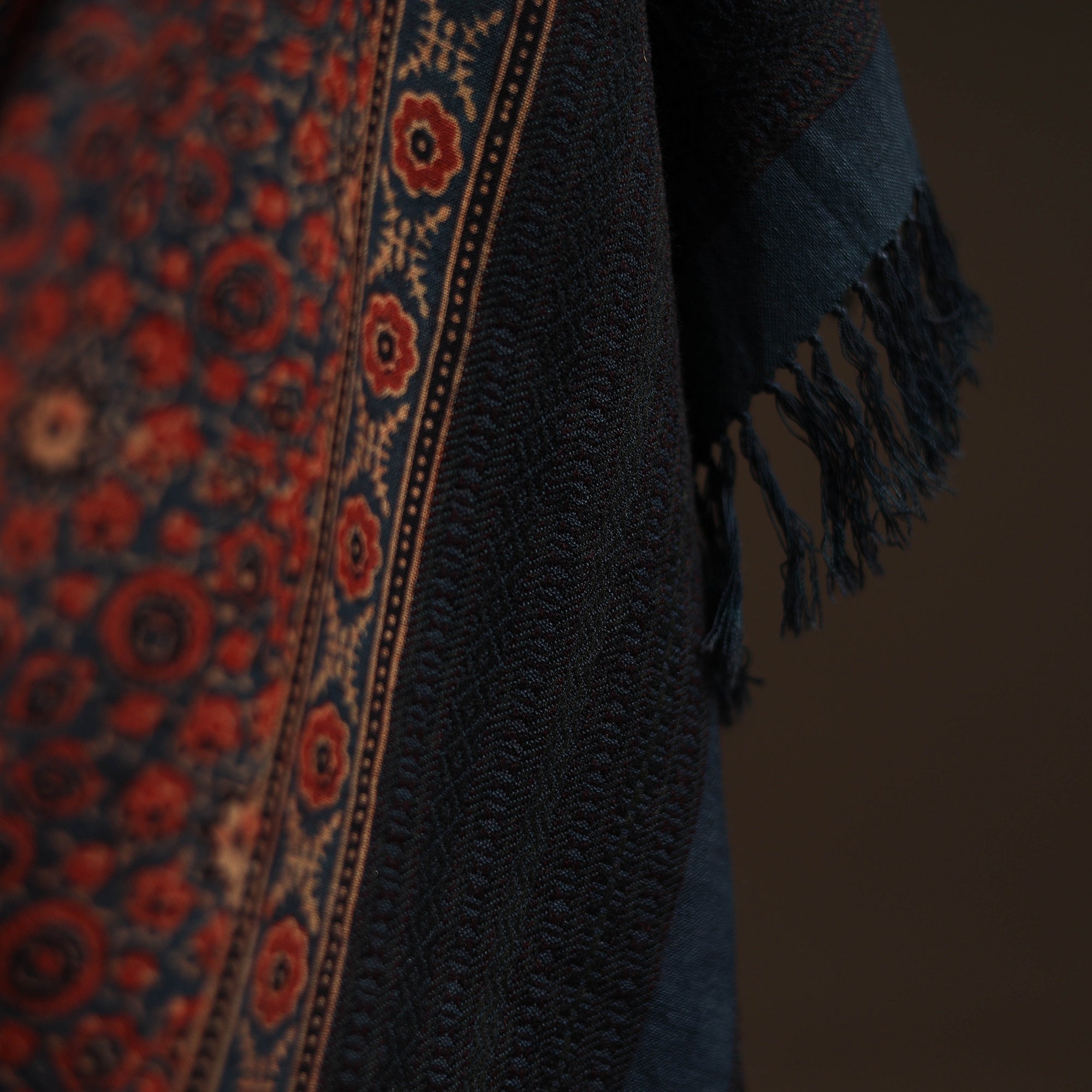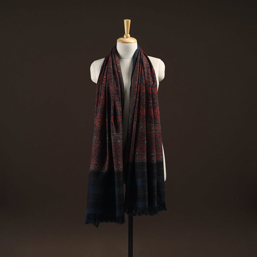Red - Kutch Handwoven Hand Block Ajrakh Print Merino Wool Shawl 01