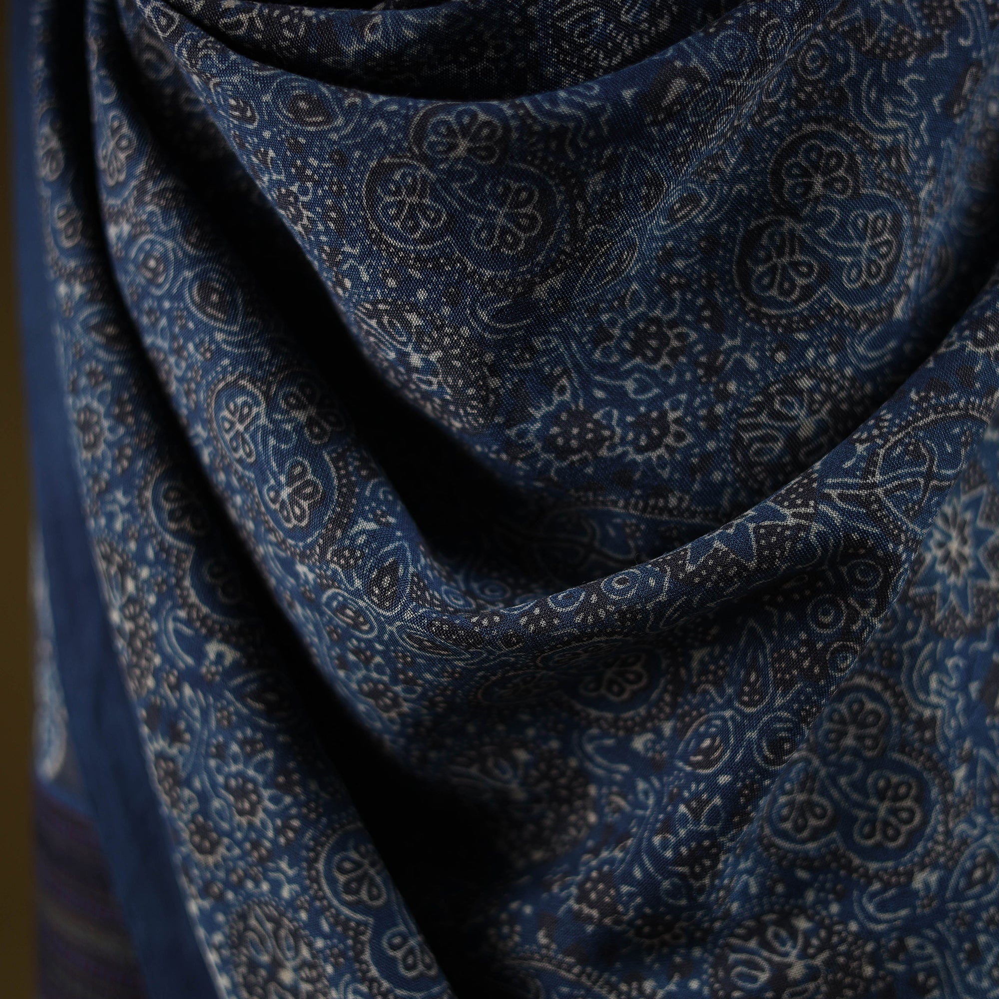 Blue ajrakh shawl is crafted by skilled artisan Vankar Bhimji Kanji from Bhuj, Gujarat. Handwoven for the winter season, it features ajrakh block prints with Kutchi motifs, created using natural dyes and long-practised techniques. Made from Merino wool, it offers both warmth and comfort. A perfect blend of tradition and style, ideal for winter wear.