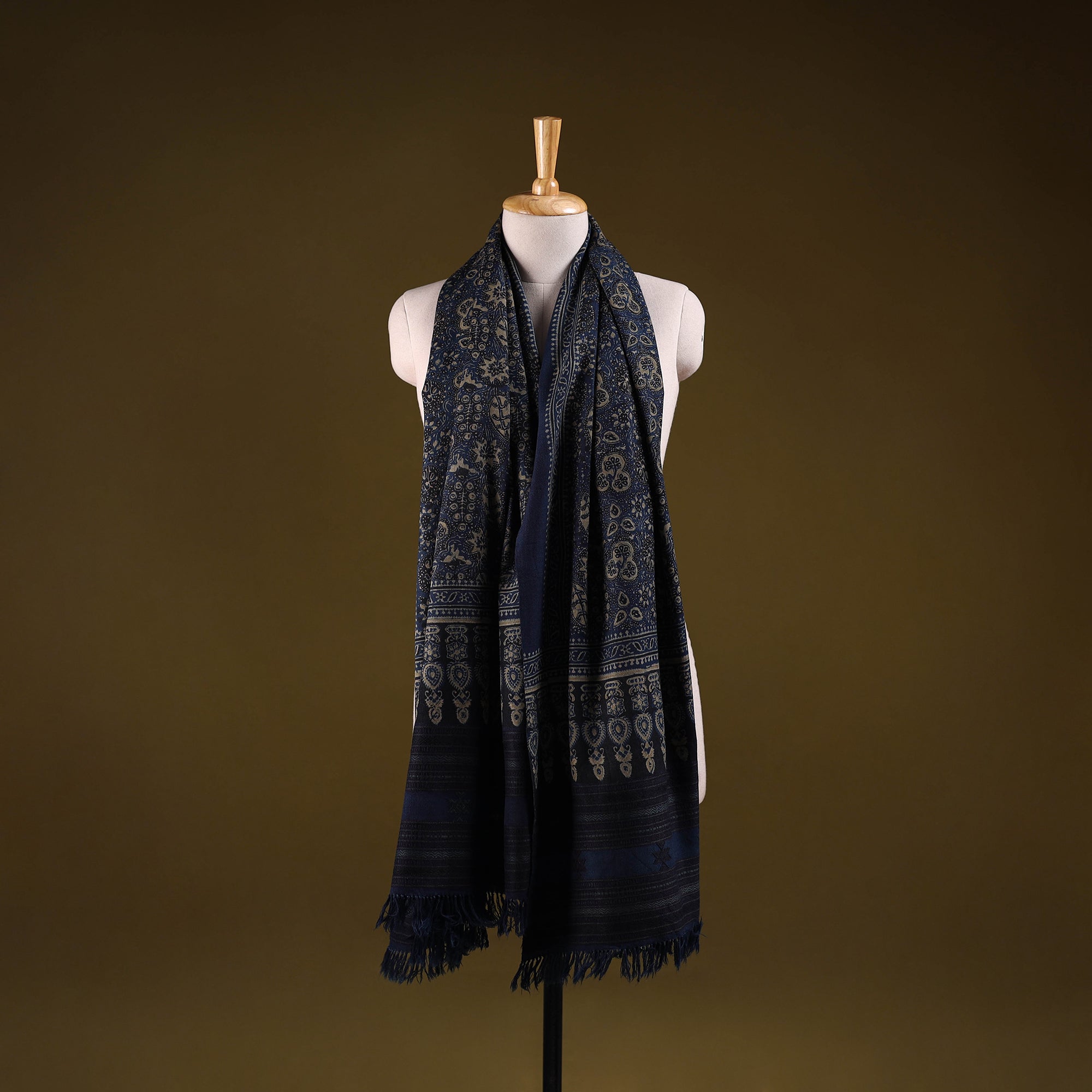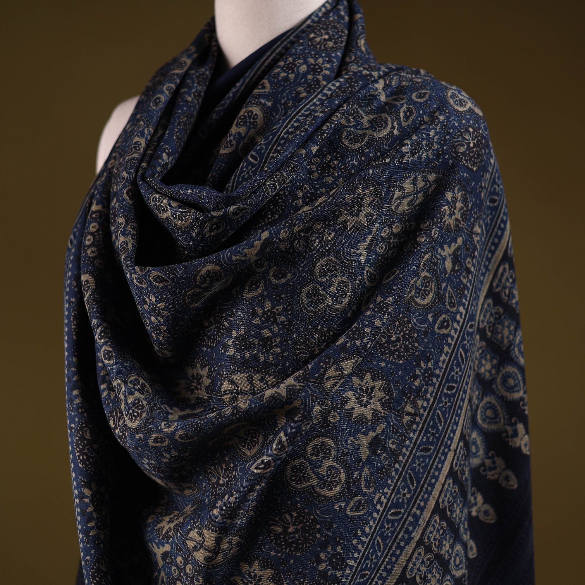 Blue ajrakh shawl is crafted by skilled artisan Vankar Bhimji Kanji from Bhuj, Gujarat. Handwoven for the winter season, it features ajrakh block prints with Kutchi motifs, created using natural dyes and long-practised techniques. Made from Merino wool, it offers both warmth and comfort. A perfect blend of tradition and style, ideal for winter wear.