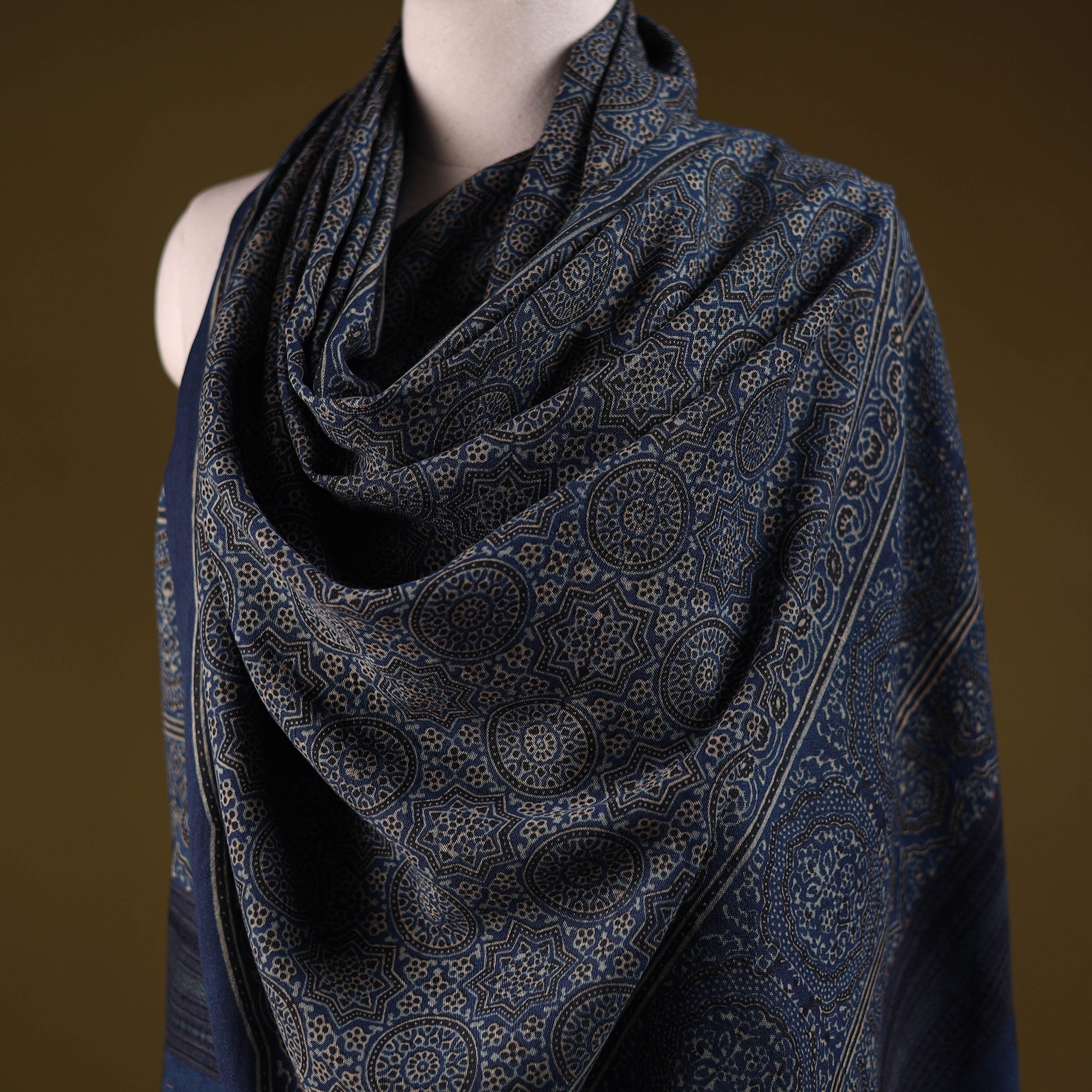 Blue ajrakh shawl is crafted by skilled artisan Vankar Bhimji Kanji from Bhuj, Gujarat. Handwoven for the winter season, it features ajrakh block prints with Kutchi motifs, created using natural dyes and long-practised techniques. Made from Merino wool, it offers both warmth and comfort. A perfect blend of tradition and style, ideal for winter wear.
