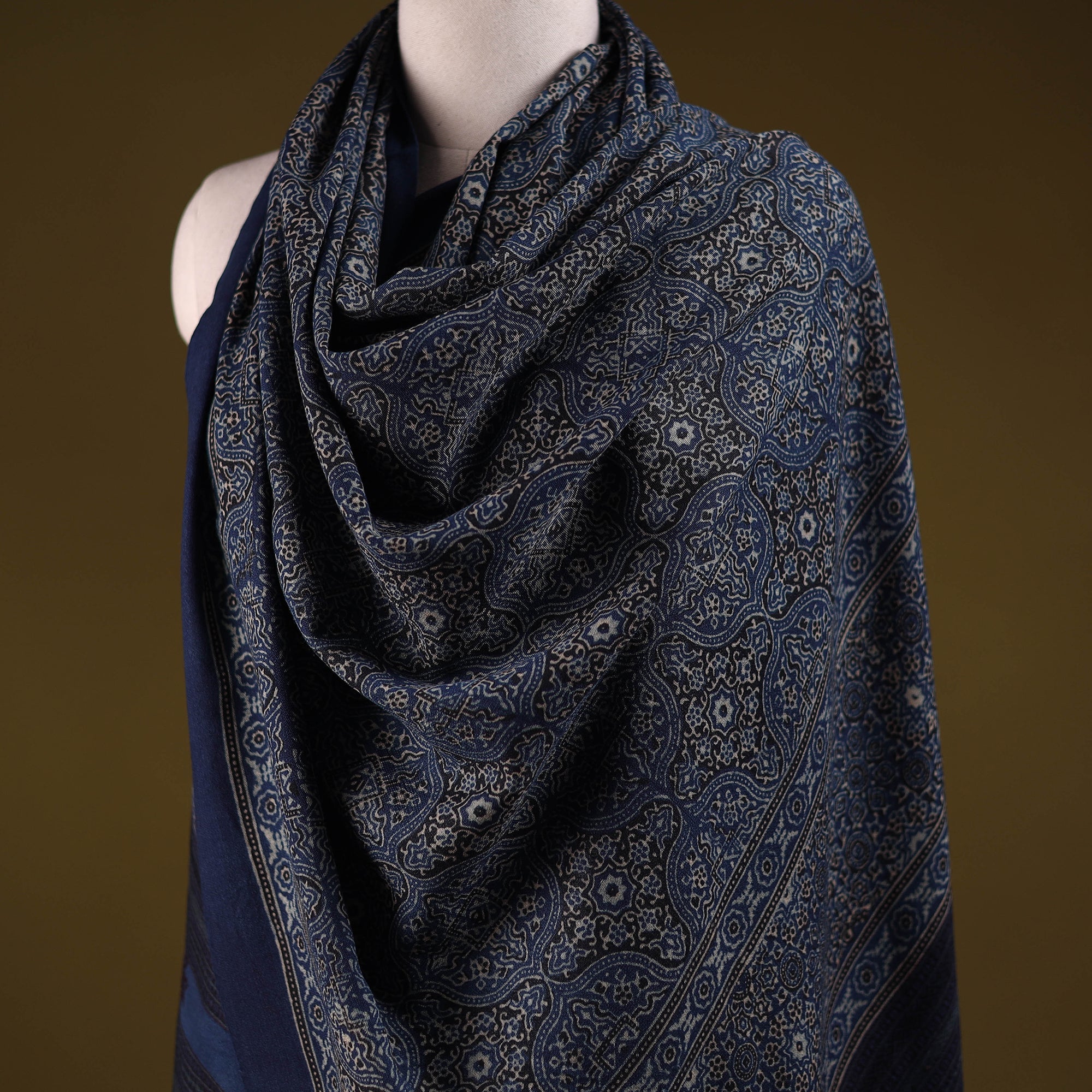 Blue ajrakh shawl is crafted by skilled artisan Vankar Bhimji Kanji from Bhuj, Gujarat. Handwoven for the winter season, it features ajrakh block prints with Kutchi motifs, created using natural dyes and long-practised techniques. Made from Merino wool, it offers both warmth and comfort. A perfect blend of tradition and style, ideal for winter wear.