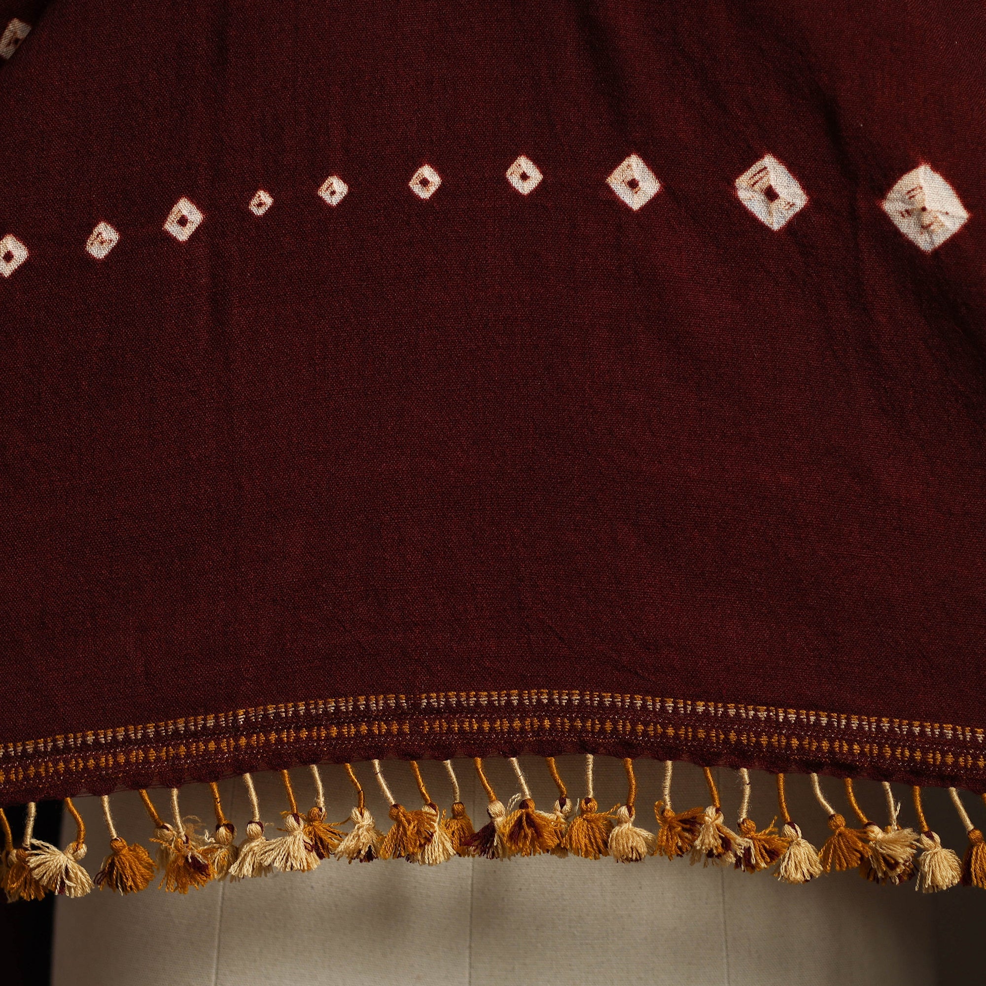 This maroon merino wool shawl is handwoven in Kutch, Gujarat, and features a traditional bandhani tie-dye pattern with tassels. Crafted by Vinay Siju and his team of artisans, it offers exceptional warmth and softness, perfect for winter wear.