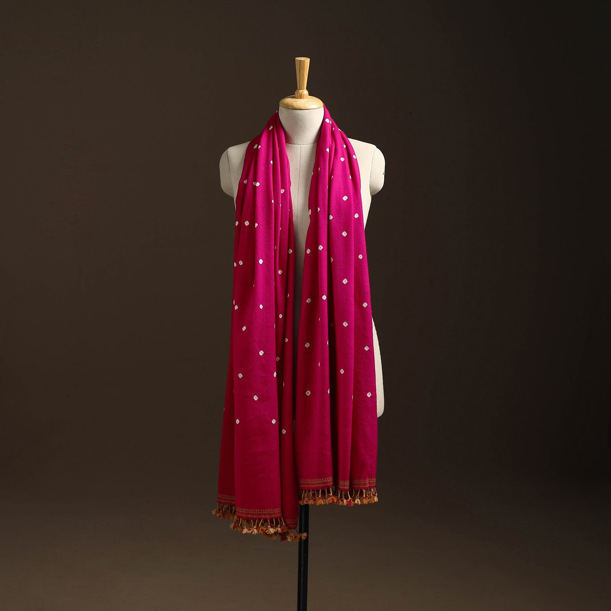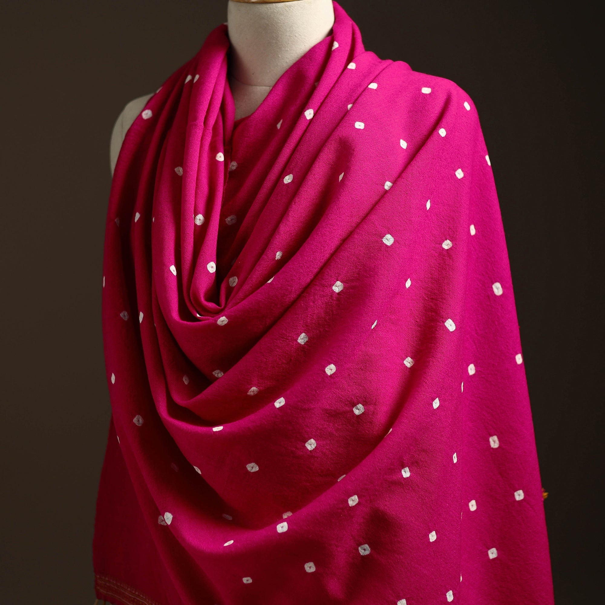 Pink kutch handwoven merino wool bandhani tie-dye shawl comes from Kutch, Gujarat. Each piece is woven with care by Vinay Siju using traditional methods. The merino wool feels warm and soft on the skin, making it perfect for winter. Easy to wear every day or for special occasions.