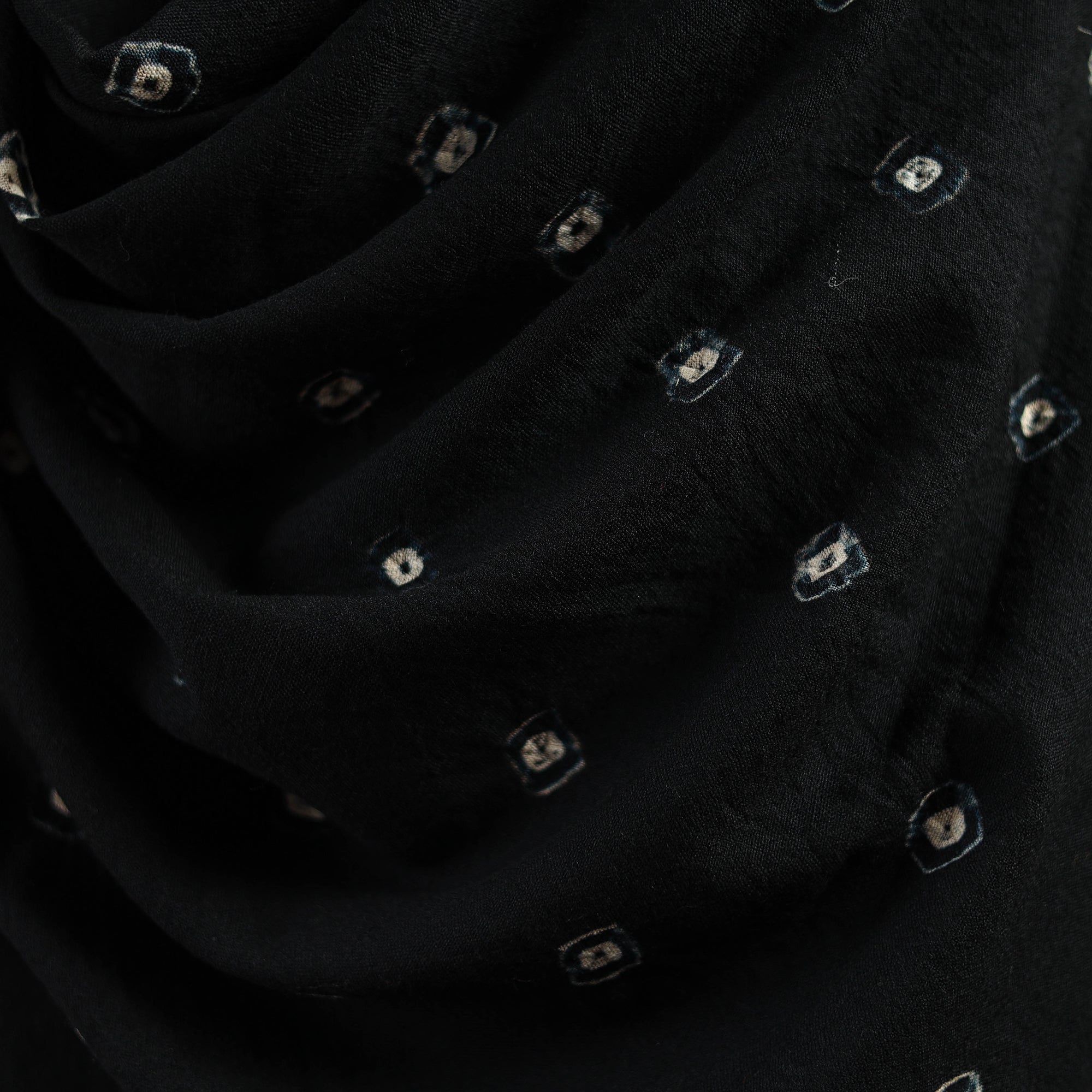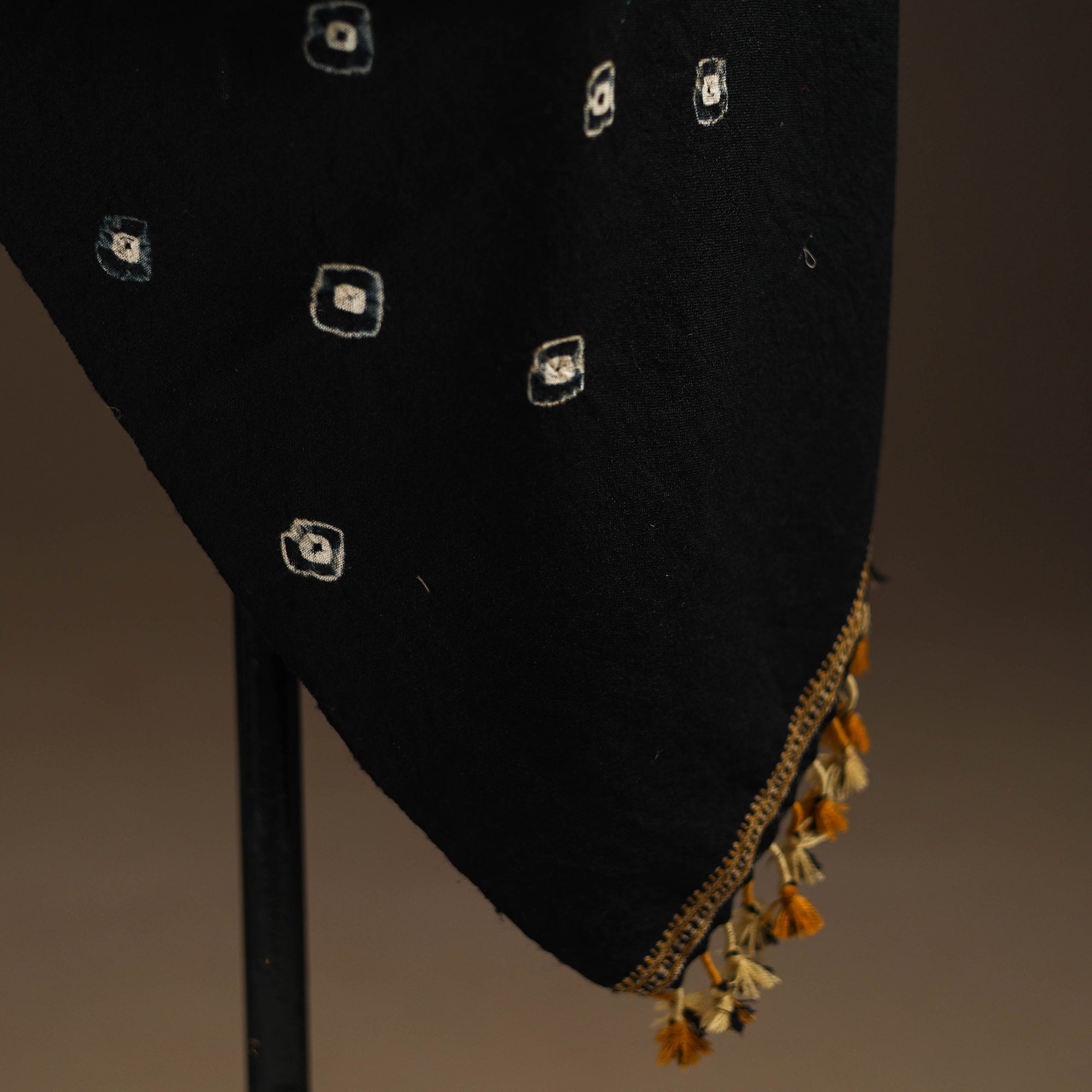 | Material | Black bandhani shawl with tassels handwoven by Vinay Siju in Bhuj, Gujarat. Created using the bandhani tie-dye technique, where the fabric is carefully tied in small sections before dyeing. Made from merino wool to provide reliable warmth. A practical choice for everyday winter wear or outings. |