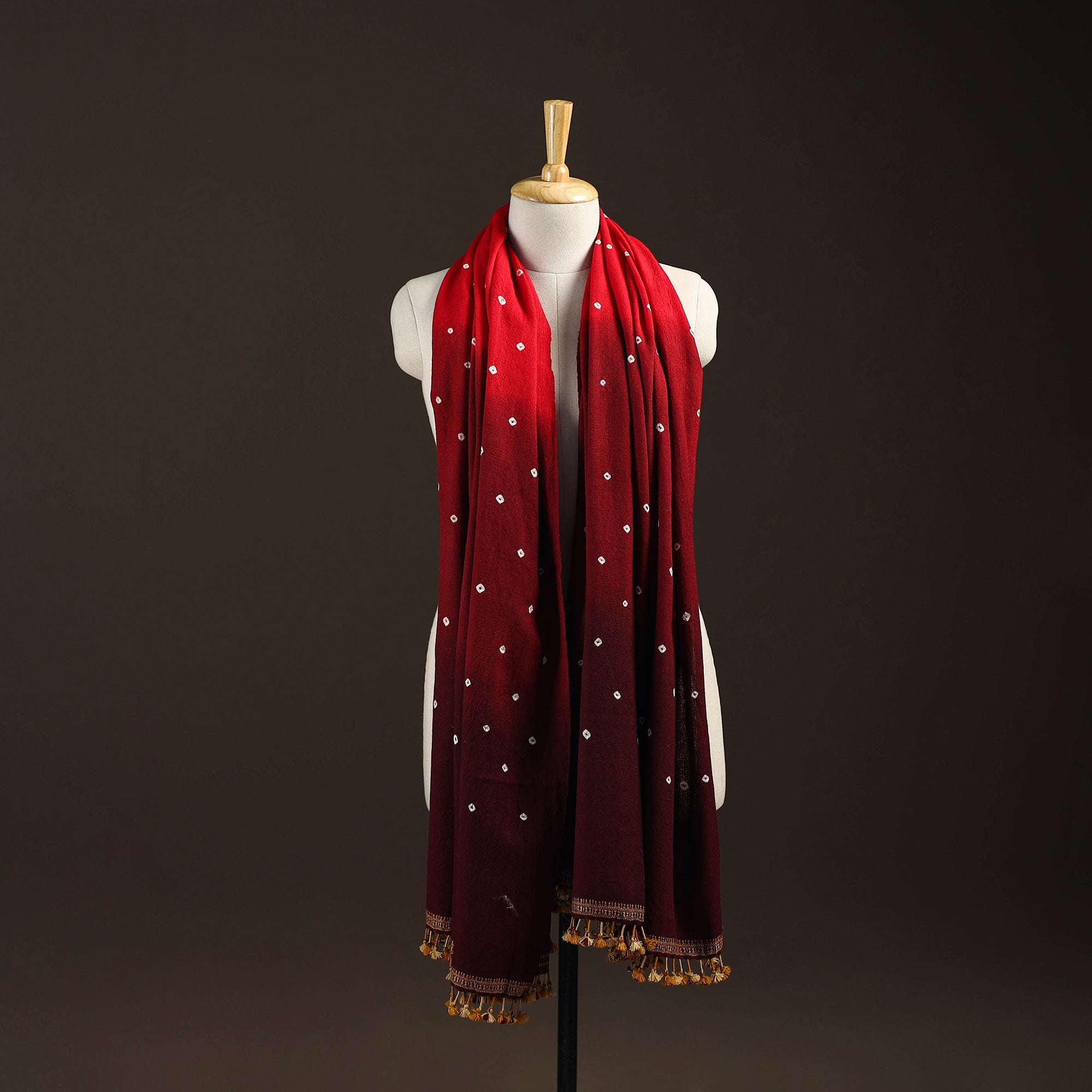 Red bandhani shawl with tassels handwoven by Vinay Siju in Bhuj, Gujarat. Created using the bandhani tie-dye technique, where the fabric is carefully tied in small sections before dyeing. Made from merino wool to provide reliable warmth. A practical choice for everyday winter wear or outings.