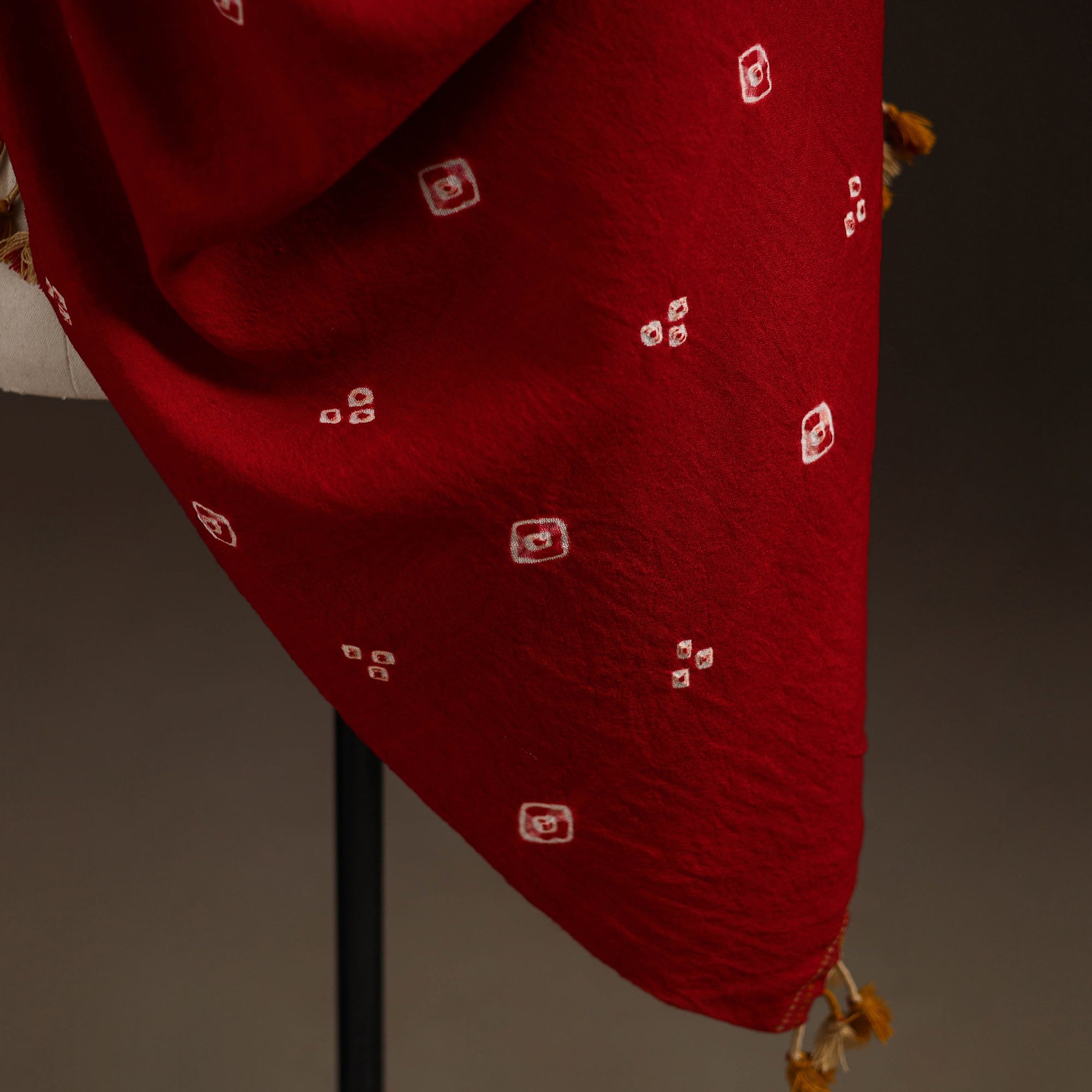 Bandhani shawl handwoven by Vinay Siju in Bhuj, Gujarat. Created using tie-dye technique, where the fabric is carefully tied in small sections before dyeing. Designed with traditional Kutchi motifs and tassels. Made from merino wool to provide reliable warmth. A practical choice for everyday winter wear or outings.