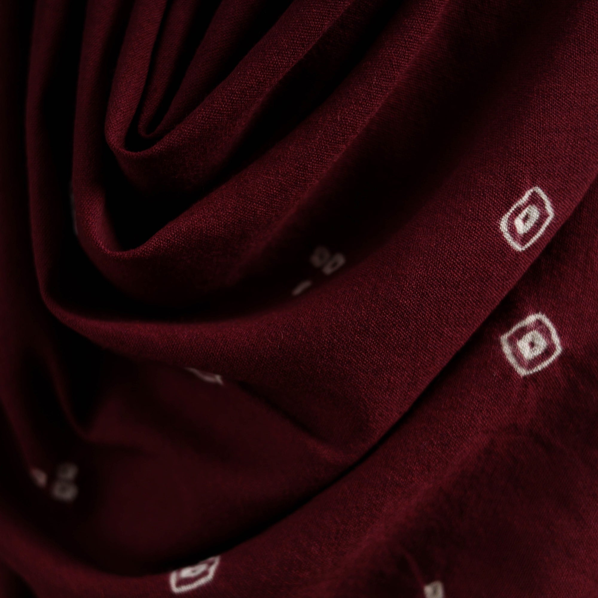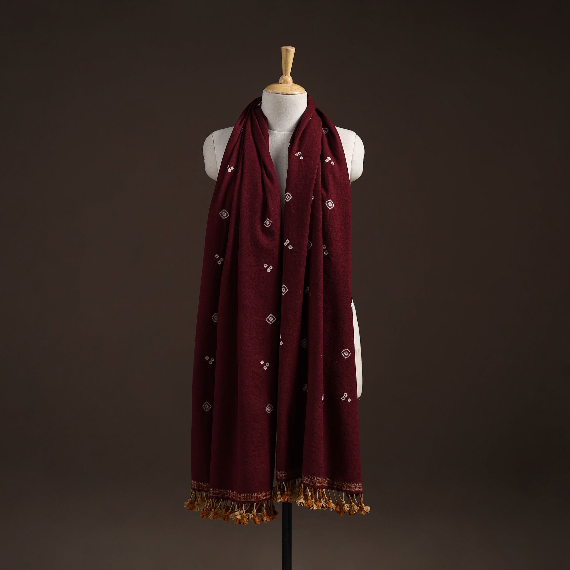 Bandhani shawl handwoven by Vinay Siju in Bhuj, Gujarat. Created using tie-dye technique, where the fabric is carefully tied in small sections before dyeing. Designed with traditional Kutchi motifs and tassels. Made from merino wool to provide reliable warmth. A practical choice for everyday winter wear or outings.