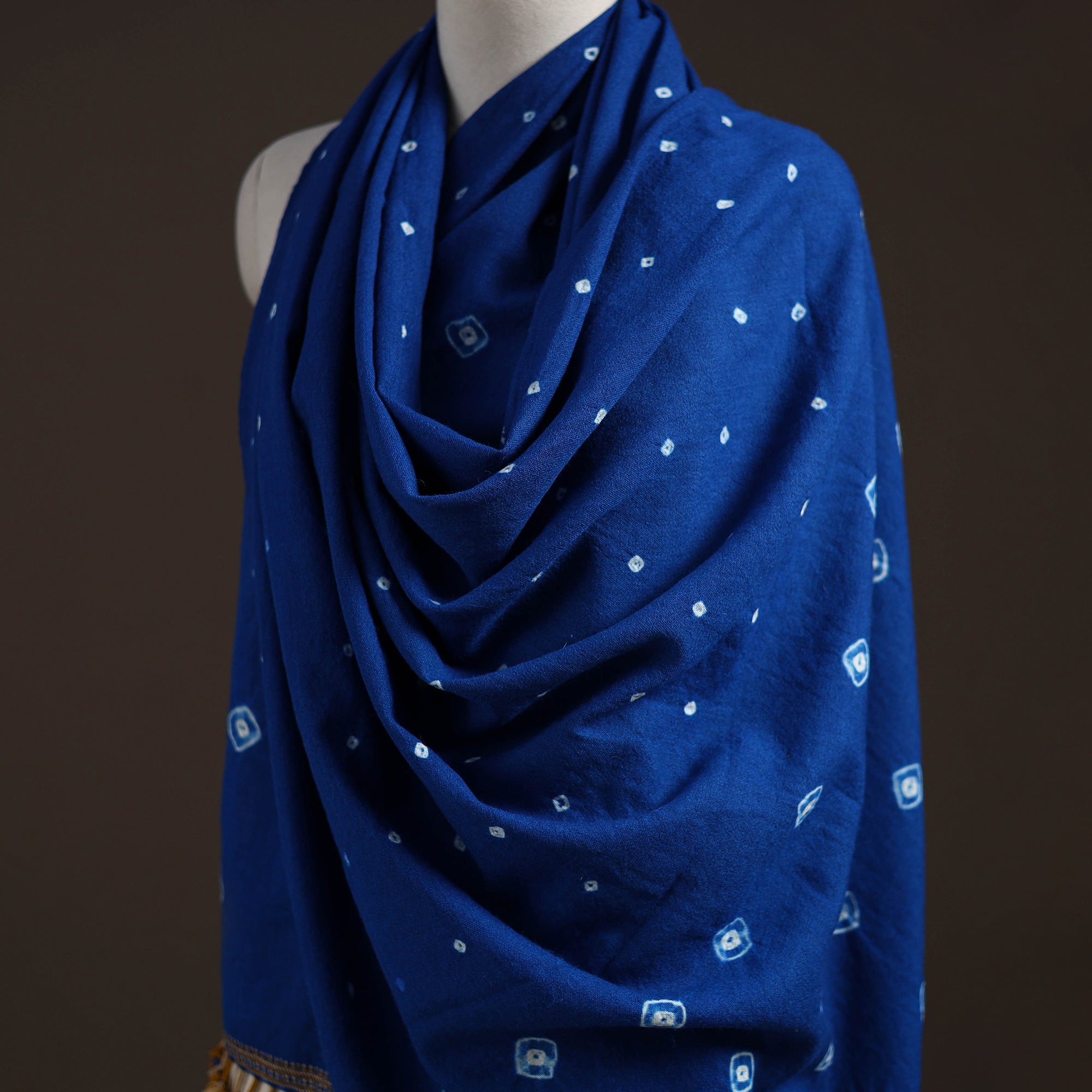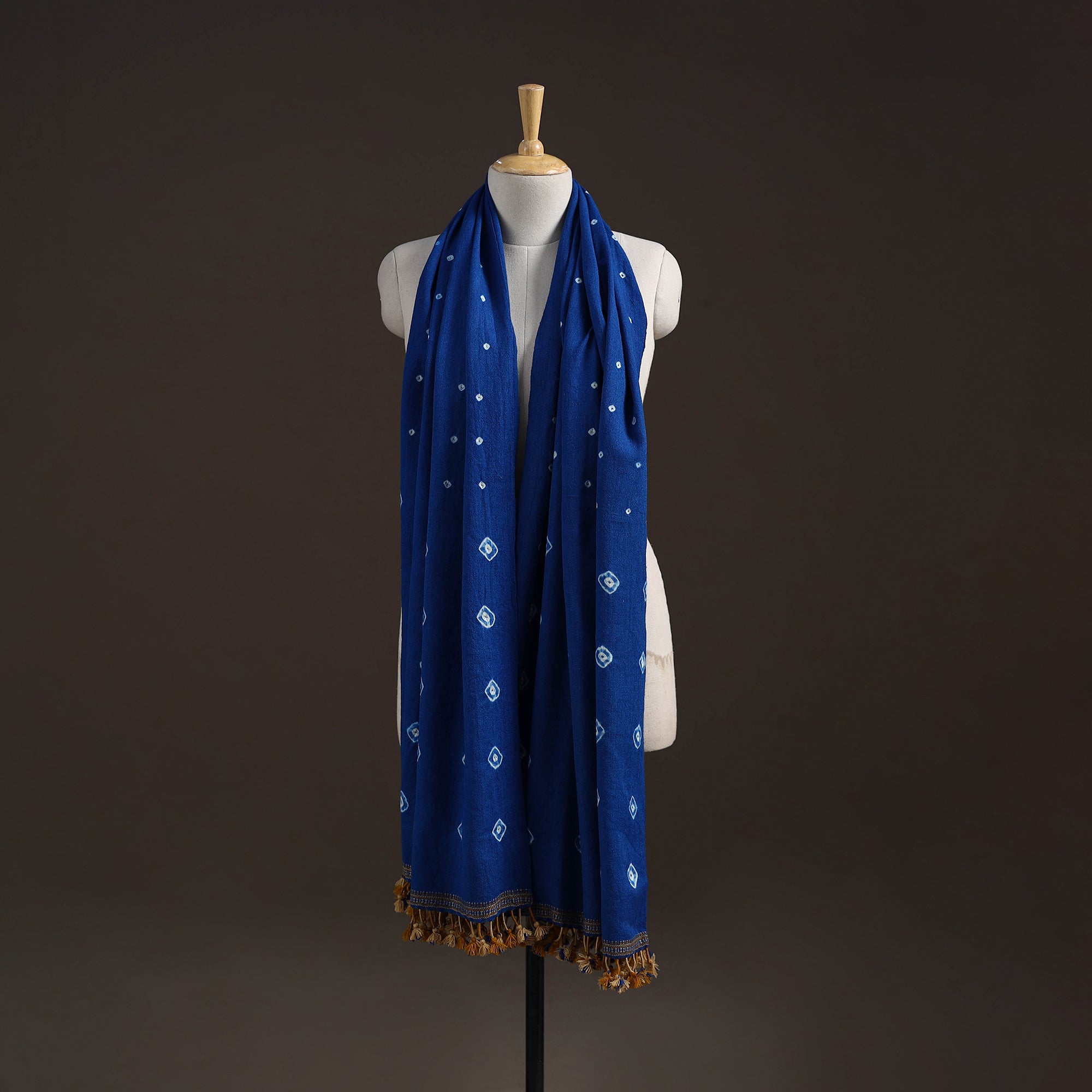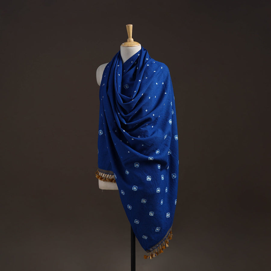 Bandhani shawl handwoven by Vinay Siju in Bhuj, Gujarat. Created using tie-dye technique, where the fabric is carefully tied in small sections before dyeing. Designed with traditional Kutchi motifs and tassels. Made from merino wool to provide reliable warmth. A practical choice for everyday winter wear or outings.