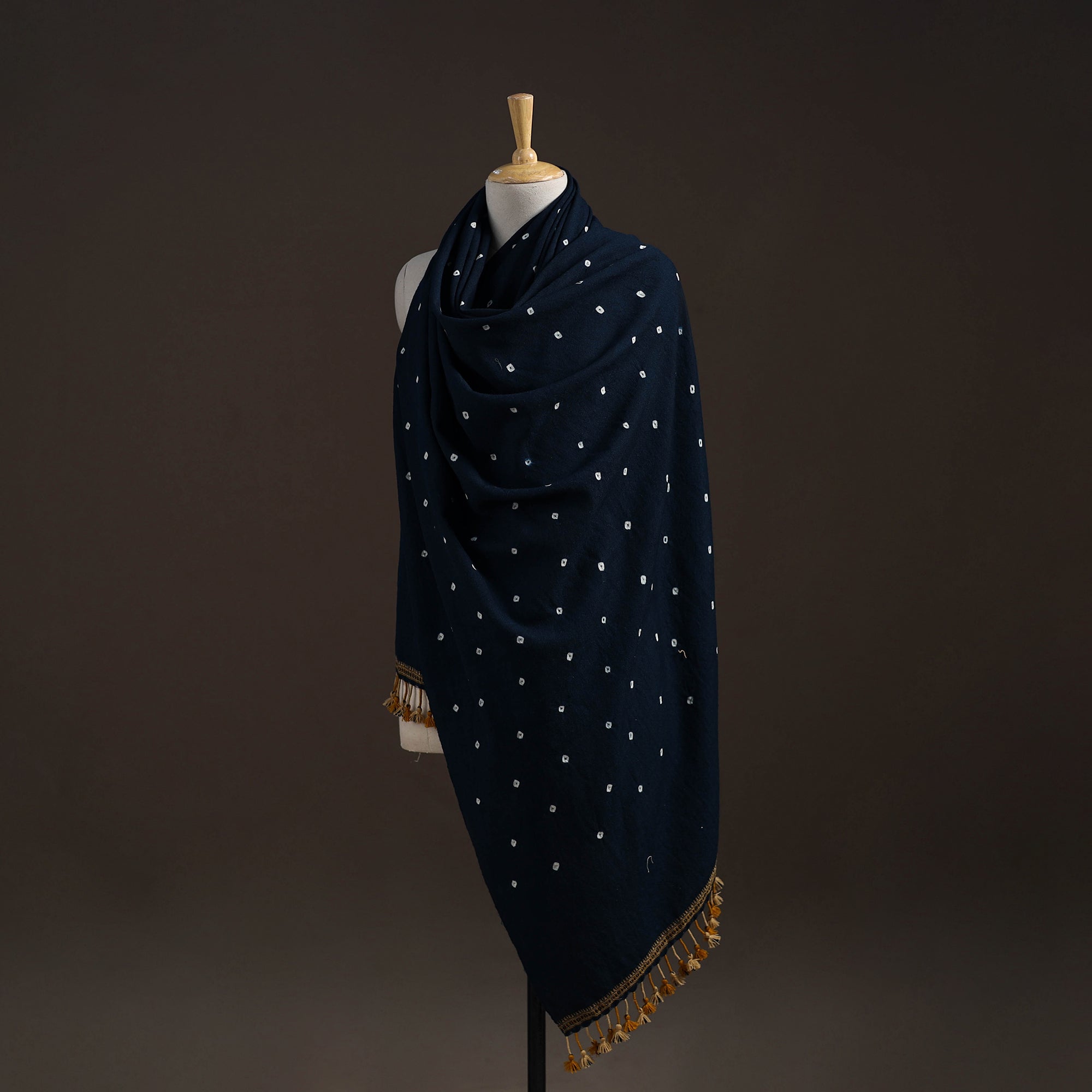 Bandhani shawl handwoven by Vinay Siju in Bhuj, Gujarat. Created using tie-dye technique, where the fabric is carefully tied in small sections before dyeing. Designed with traditional Kutchi motifs and tassels. Made from merino wool to provide reliable warmth. A practical choice for everyday winter wear or outings.