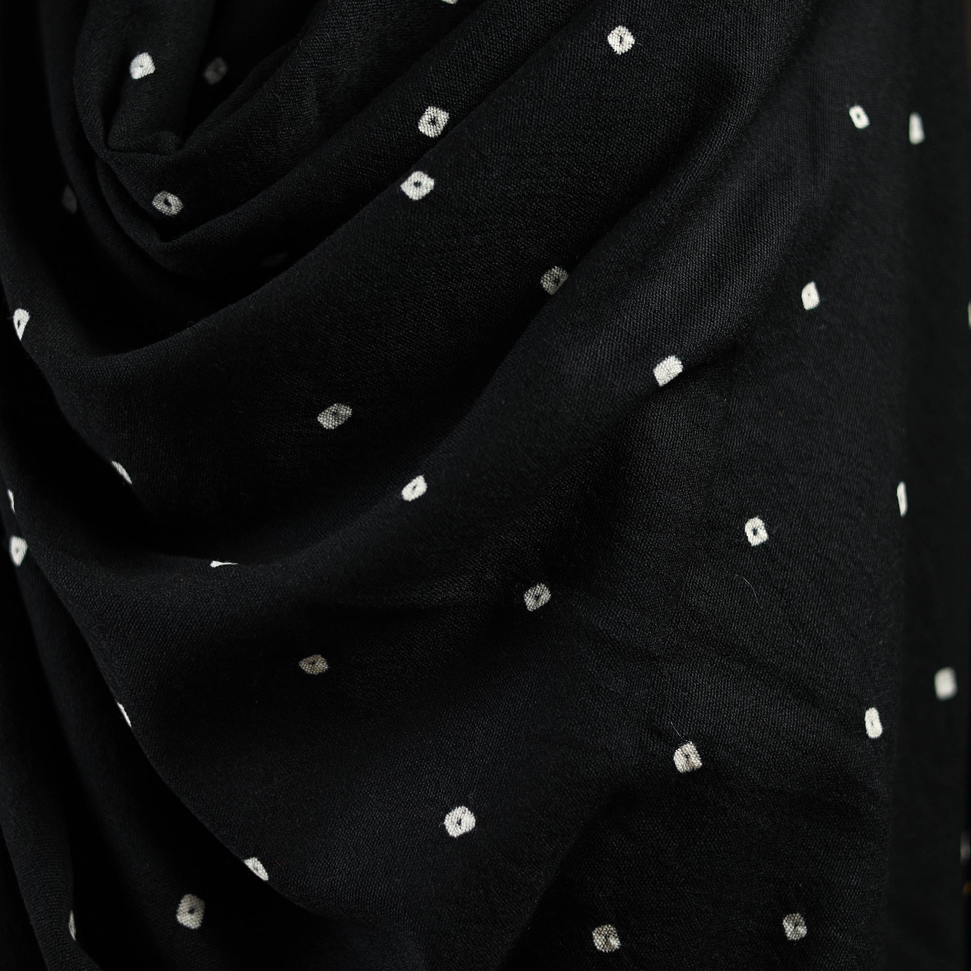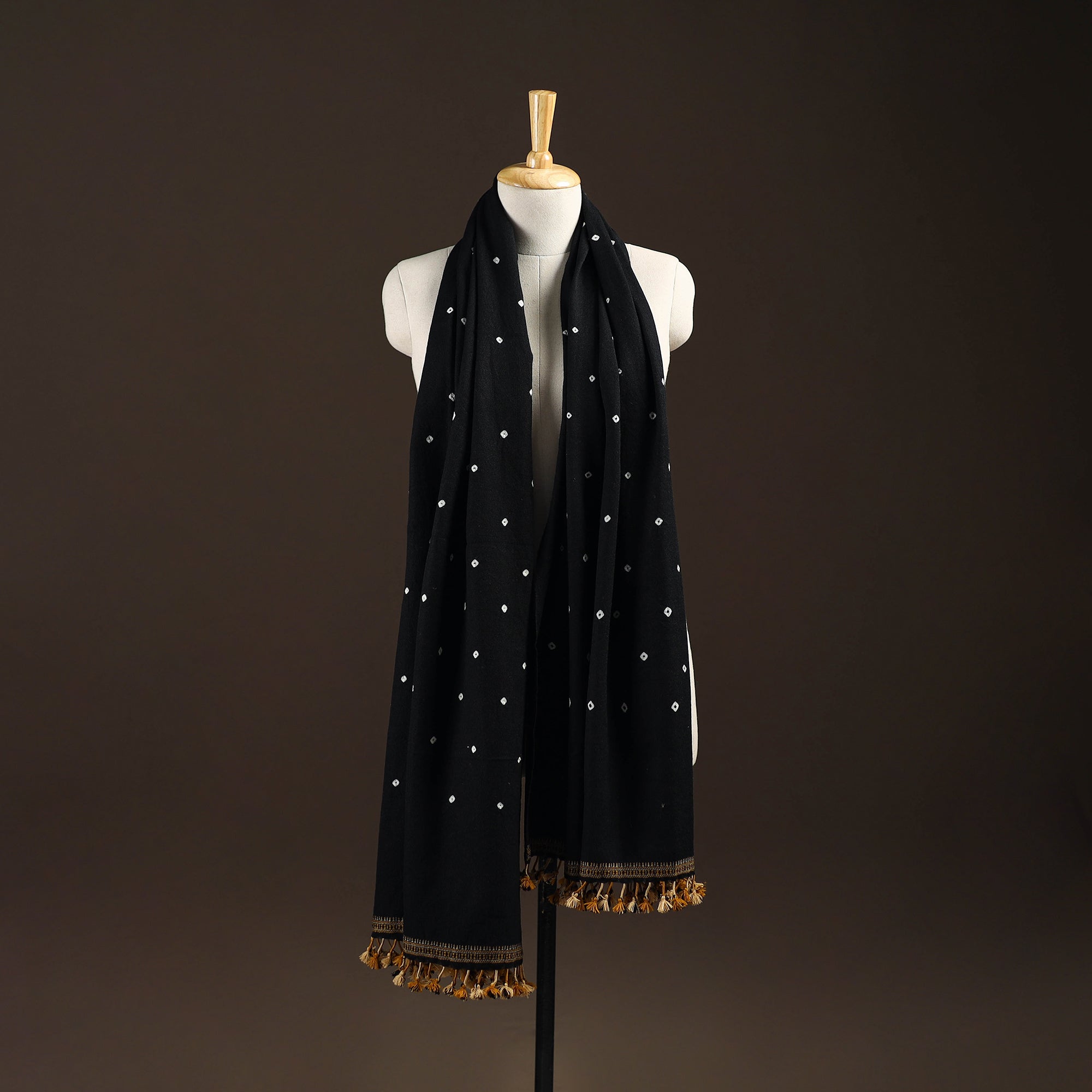Black bandhani shawl with tassels handwoven by Vinay Siju in Bhuj, Gujarat. Created using the bandhani tie-dye technique, where the fabric is carefully tied in small sections before dyeing. Made from merino wool to provide reliable warmth. A practical choice for everyday winter wear or outings.