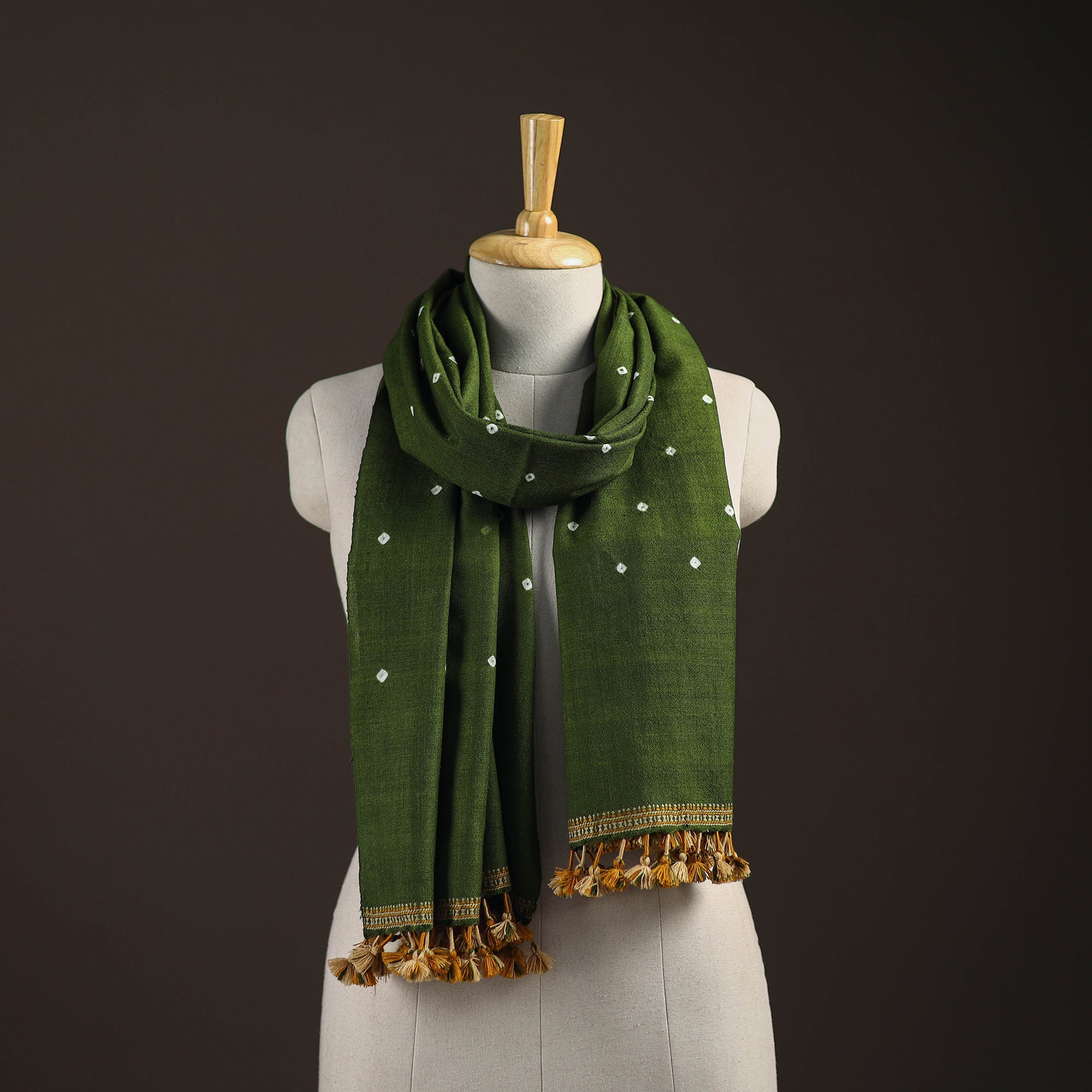 Bandhani stole with tassels handwoven by Vinay Siju in Bhuj, Gujarat. Created using the bandhani tie-dye technique, where the fabric is carefully tied in small sections before dyeing. Made from merino wool to provide reliable warmth. A practical choice for everyday winter wear or outings.
