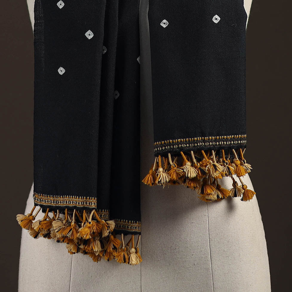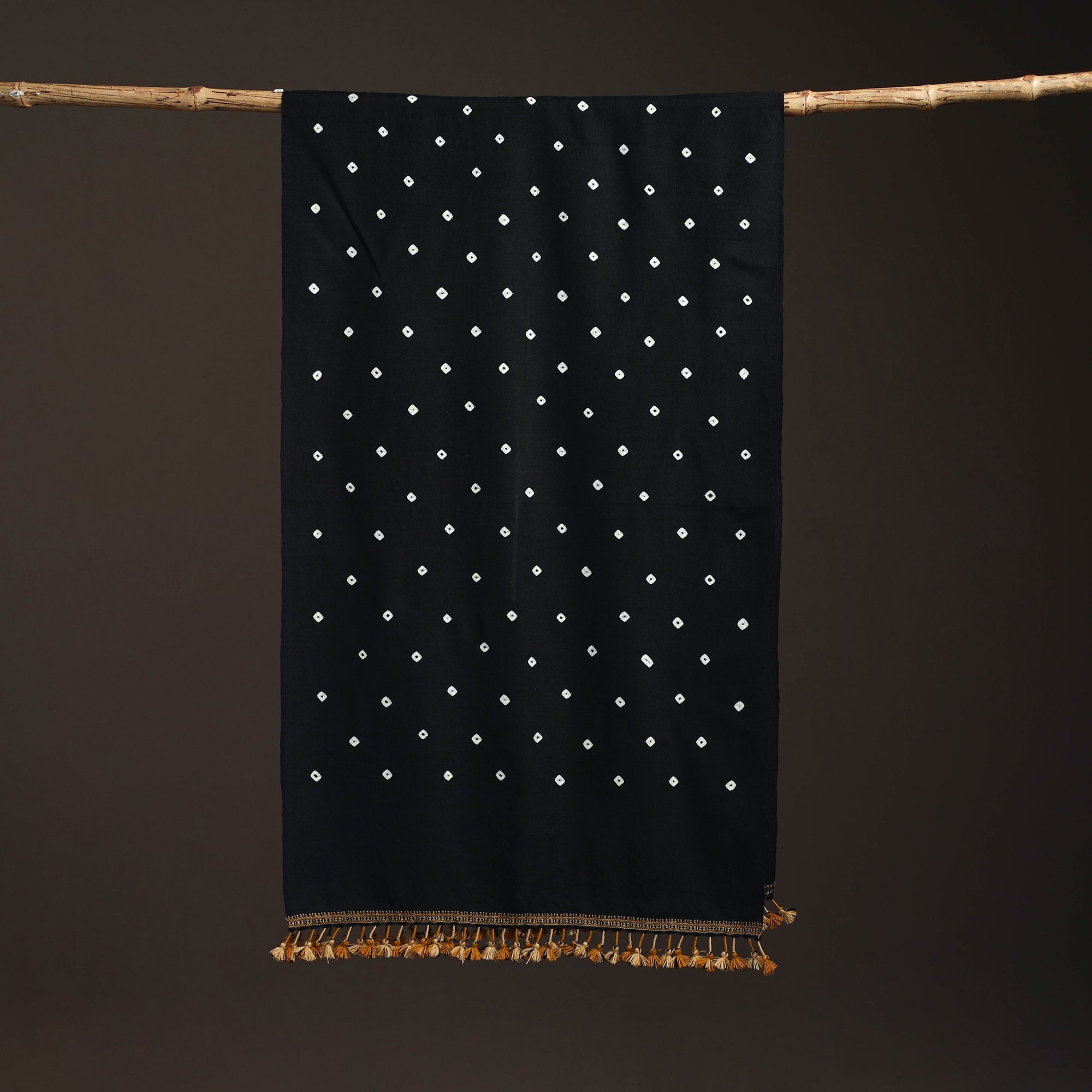 Bandhani stole with tassels handwoven by Vinay Siju in Bhuj, Gujarat. Created using the bandhani tie-dye technique, where the fabric is carefully tied in small sections before dyeing. Made from merino wool to provide reliable warmth. A practical choice for everyday winter wear or outings.