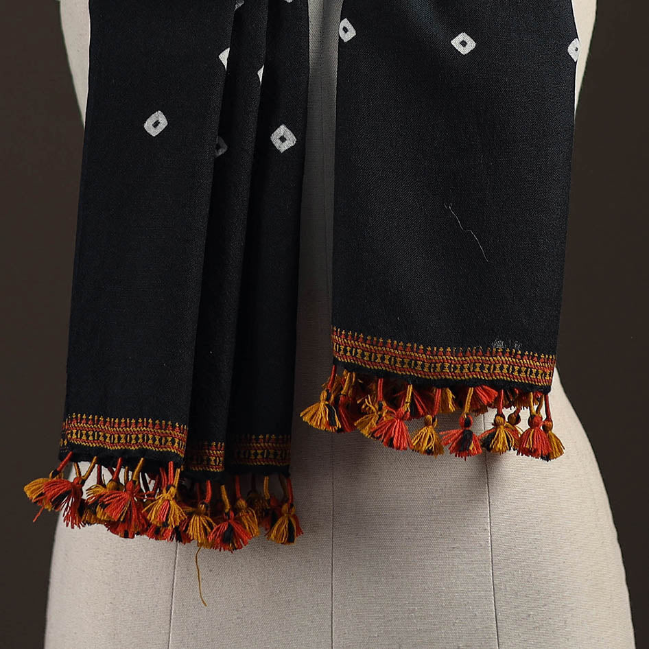 Black bandhani stole with tassels handwoven by Vinay Siju in Bhuj, Gujarat. Created using the bandhani tie-dye technique, where the fabric is carefully tied in small sections before dyeing. Made from merino wool to provide reliable warmth. A practical choice for everyday winter wear or outings.